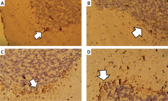 Vascular endothelial growth factor immunostaining in the cerebellar cortex. A – Control group. B – Monosodium glutamate group. C – Bone marrow mesenchymal stem cell group. D – Adipose tissue stem cell group