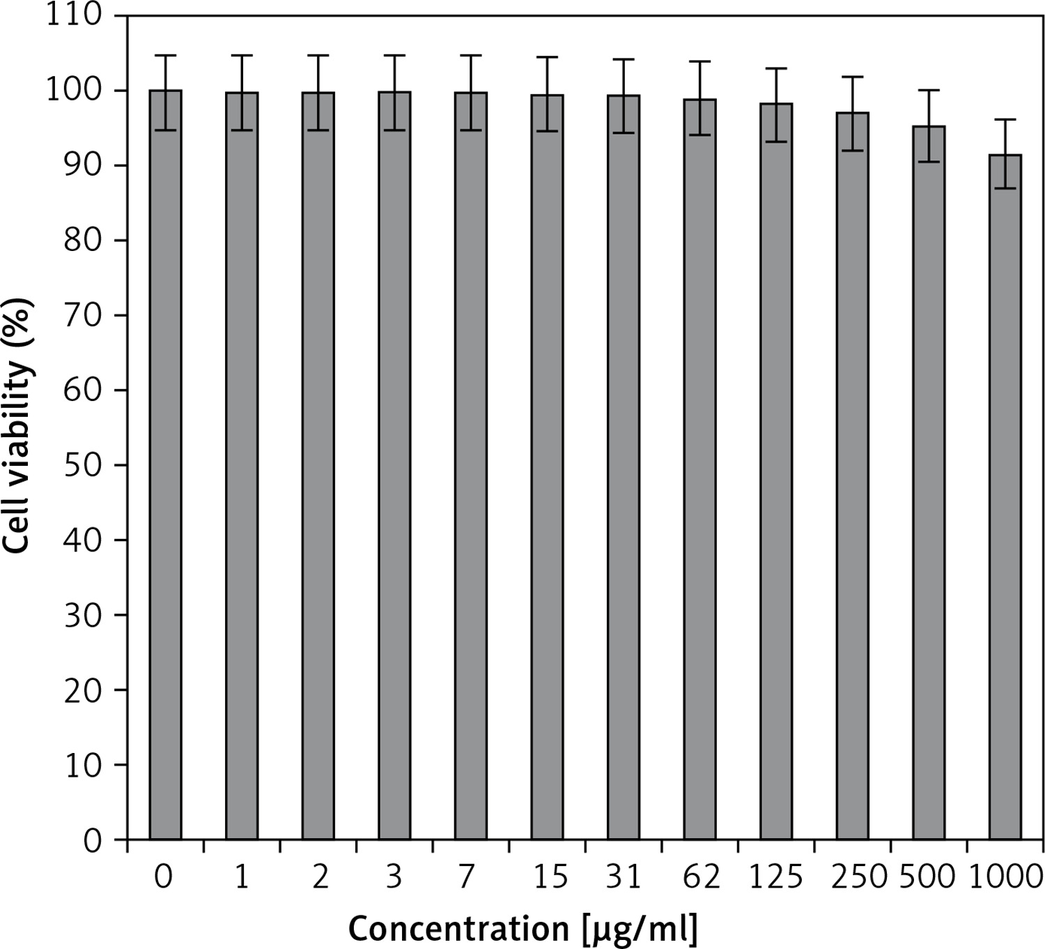 In the present study, the cytotoxicity of Equisetum arvense L was explored by studying its interaction with normal (HUVEC) and human colorectal carcinoma cell lines, i.e. colorectal adenocarcinoma (HT-29), colorectal carcinoma (HCT 116), ileocecal colorectal adenocarcinoma (HCT-8 [HRT-18]), and Burkitt’s lymphoma (Ramos.2G6.4C10) by MTT assay for 48 h. The interactions expressed as cell viability (%) were observed at different Equisetum arvense L concentrations (0–1000 μg/ml) with the five cell lines which are shown in detail in Figures 1 and 2. In all the cases, the % cell viability decreased with increasing Equisetum arvense L sample concentrations.