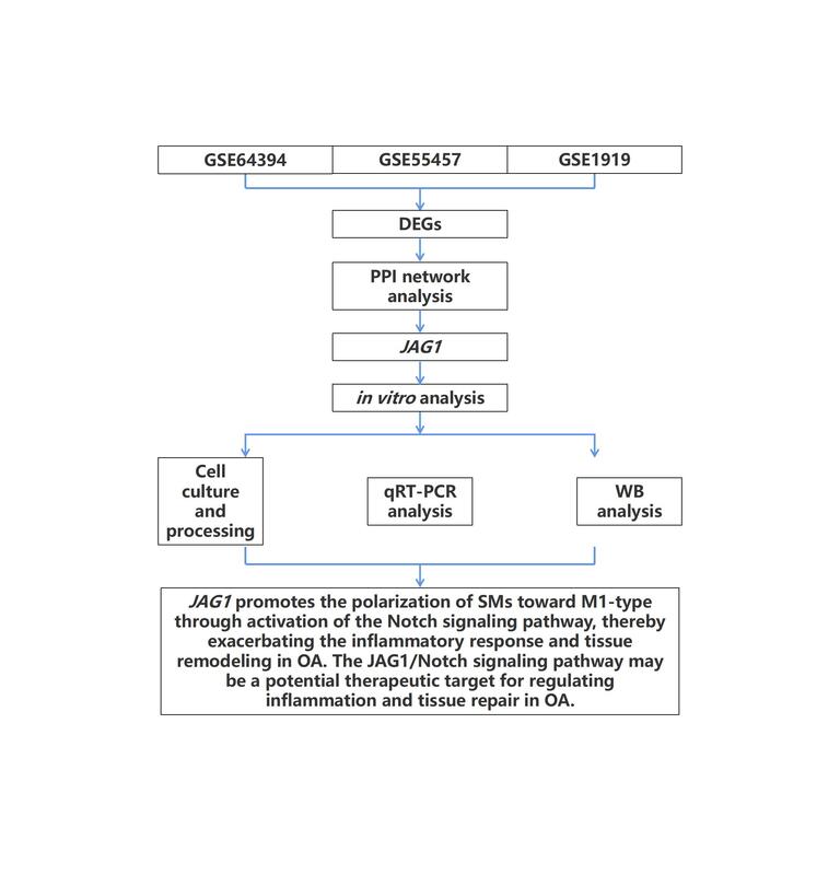 Osteoarthritis (OA) is characterized by chronic synovial inflammation, in which synovial macrophages (SMs) play a crucial role. The contribution of JAG1 to macrophage polarization in OA remains unclear.