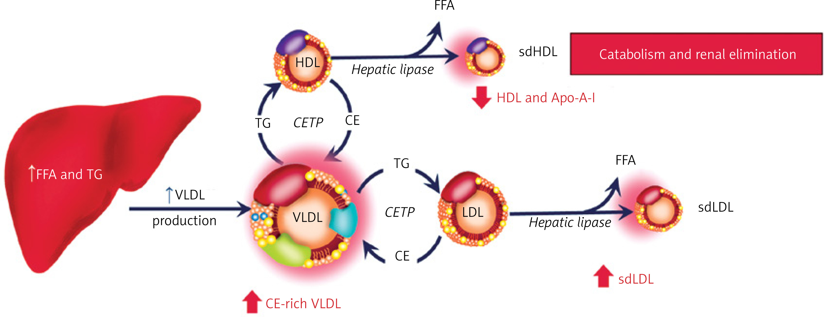 CE – cholesteryl ester, CETP – ester transfer protein, FFA – free fatty acid, sdHDL – small – dense high-density lipoprotein, sdLDL – small – dense low-density lipoprotein, TG – triglyceride, VLDL – very low-density lipoprotein.