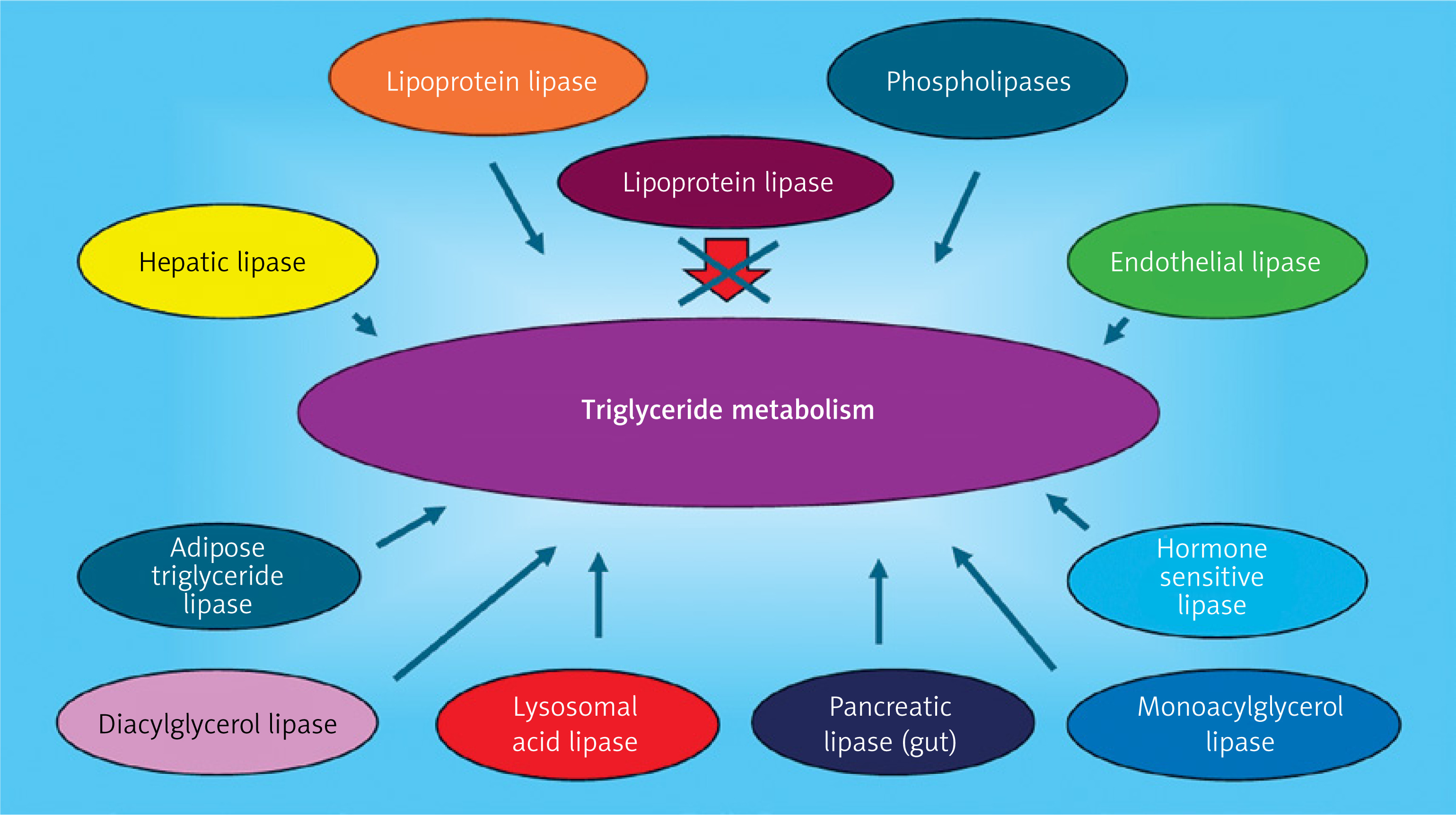 Triglyceride metabolism scheme. When lipoprotein lipase activity is either inhibited or functionally severely impaired, lipoprotein (chylomicrons, VLDL and remnant lipoproteins) triglycerides are not hydrolyzed efficiently in serum. However, other enzymes continue to lipolyze triglycerides and can release fatty acids from cholesterol esters. In serum, endothelial lipase and hepatic lipase have the capacity to hydrolyze triglycerides. In adipose tissue, both hormone sensitive lipase and adipose triglyceride lipase work in a complementary manner to liberate fatty acids from stored triglyceride. In the gut pancreatic lipase can hydrolyze triglycerides for enterocyte absorption of free fatty acids. Within cells, phospholipases, diacylglycerol and monoglycerol lipases, and lysosomal acid lipase (LAL) participate in triglyceride metabolism. LAL also hydrolyzes cholesterol esters to liberate fatty acid
