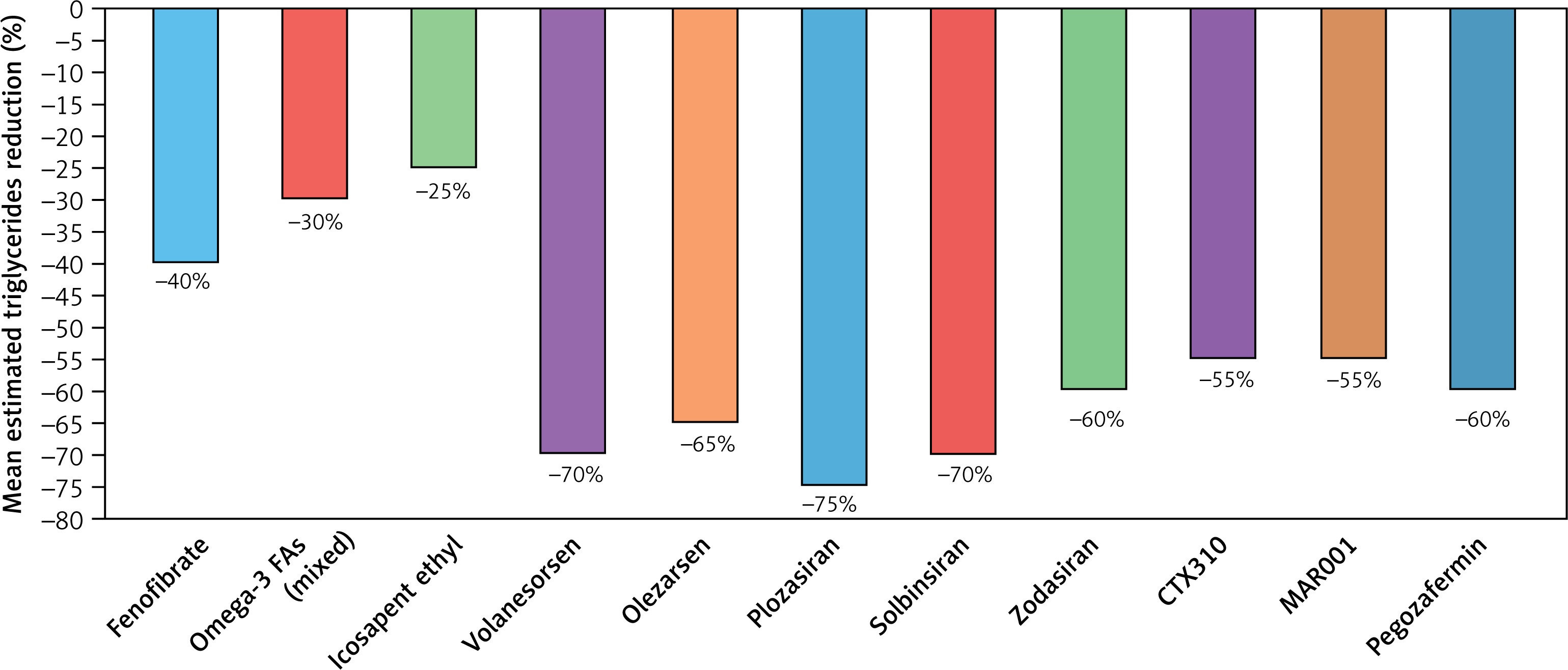The efficacy of olezarsen and plozasiran has been investigated in randomized, placebo controlled trials. In A Study of Olezarsen Administered to Patients With Familial Chylomicronemia Syndrome (BALANCE), 66 patients with genetically confirmed FCS (homozygous or heterozygous compound loss function mutations in the genes for LPL, apoC2, apoA5, LMF-1, or GPIHBP1) and fasting TG ≥ 880 mg/dl (≥ 10 mmol/l) were randomized to receive placebo or olezarsen at 50 or 80 mg monthly [106]. The baseline mean (±SD) triglyceride level for participants was 2630 ±1315 mg/dl; 71% had a history of acute pancreatitis in the preceding 10 years. After 6 months of therapy, placebo-adjusted triglyceride reductions were –22.4% (95% CI: –47.2 to 2.5; p = 0.08) with the 50 mg dose and –43.5% (95% CI: –69.1 to –17.9; p < 0.001) with the 80-mg dose. The mean percent change in apoC-III levels after 6 months of therapy were –65.6% (95% CI: –82.6 to –48.3) in the 50-mg group and –73.7% (95% CI: –94.6 to –52.8) in the 80 mg group. Risk for pancreatitis was reduced: after 53 weeks there were 11 cases of pancreatitis in the placebo group and 1 case in each olezarsen treatment groups (RR [pooled olezarsen groups vs. placebo] = 0.12; 95% CI: 0.02–0.66) [106]. In the PALISADE (a randomized placebo-controlled phase 3 study of plozasiran in patients with FCS) trial 75 patients with persistent chylomicronemia (median baseline triglyceride of 2044 mg/dl; with or without a genetic diagnosis) were randomized to treatment with plozasiran (25 mg or 50 mg) or placebo every 3 months for 12 months [100]. The primary end point was the placebo-adjusted median percent change in triglyceride levels at 10 months. After 10 months of therapy the median reduction in fasting triglyceride levels was –80% in the 25 mg plozasiran group, –78% in the 50 mg plozasiran group, and –17% in the placebo group (p < 0.001); apoC3 was reduced with median reductions of –93% in the 25 mg plozasiran group, –96% in the 50 mg plozasiran group, and –1% in the placebo group (p < 0.001). Multiplicity-controlled principal secondary endpoints include percent change in apoC3 at 10 and 12 months and the incidence of acute pancreatitis. The incidence of acute pancreatitis was reduced significantly (pooled plozasiran groups vs. placebo, 0.17; 95% CI: 0.03–0.94; p = 0.03) [100]. In the next analysis from the PALISADE trial the authors investigated the temporal effects of 25 mg plozasiran, the influence of genetic status on therapeutic responses, and the proportion of patients who attained guideline-recommended TG goals for reducing acute pancreatitis (AP) risk [107]. At least half the patients maintained TG levels below thresholds for preventing AP: 75% had TG < 880 mg/dl (10 mmol/l) and 50% had TG < 500 mg/dl (5.7 mmol/l), irrespective of FCS genotype. Plozasiran significantly decreased total cholesterol by –41.3% (95% CI: –60.1 to –22.6), non–HDL-C by –49.5% (95% CI: –70.3 to –28.7), and VLDL-C by –66.5% (95% CI: –92.0 to –41.0), and increased HDL-C by 51.9% (95% CI: 20.4–83.3) and apoA-I by 20.6% (95% CI: 8.6–32.7) at 12 months (all p < 0.001). Notably, despite effects on TG metabolism, plozasiran only slightly increased LDL-C concentration without changing total apoB or apoB100 concentrations; importantly, posttreatment LDL-C levels remained below the 55 mg/dl threshold associated with increased ASCVD risk. None of the lipid, lipoprotein, or apolipoprotein changes varied significantly by genotype [107].