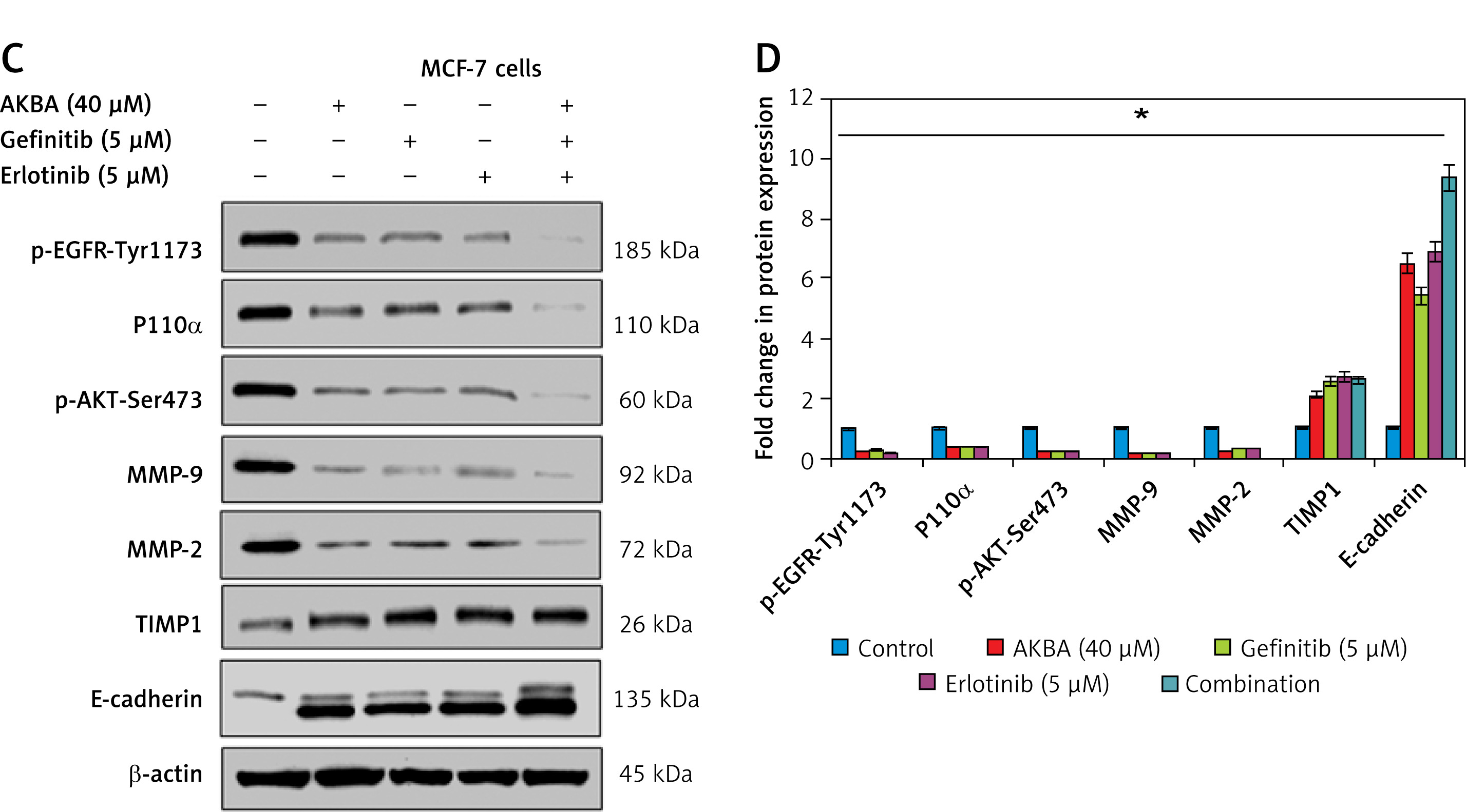 AKBA inhibits EGFR-mediated PI3K/Akt pathway and showed a significant inhibitory effect and strong synergistic effect with gefitinib and erlotinib in BC cells. A – Immunoblotting analysis of BC cells (MCF-7, BT-474) exposed to varying concentrations of AKBA (20, 30, 40 μM) shows the expression pattern of EGFR and post-EGFR signaling associated proteins (p-EGFR-Tyr1173, P110α, Akt, p-Akt-Ser473, MMP-9, MMP-2, TIMP1, E-cadherin) along with β-actin as an internal control. B – Densitometry analysis represented by histogram shows the fold change in protein expression after normalization with β-actin. C – Immunoblotting analysis of BC cells (MCF-7) exposed to concentrations of AKBA (40 μM), gefitinib (5 μM), erlotinib (5 μM) along with untreated control and combination (AKBA 40 μM + gefitinib 5 μM + erlotinib 5 μM) shows the expression pattern of EGFR-mediated PI3K/Akt signaling associated proteins along with β-actin as an internal control. D – Densitometry analysis represented by histogram shows the fold change in protein expression after normalization with β-actin