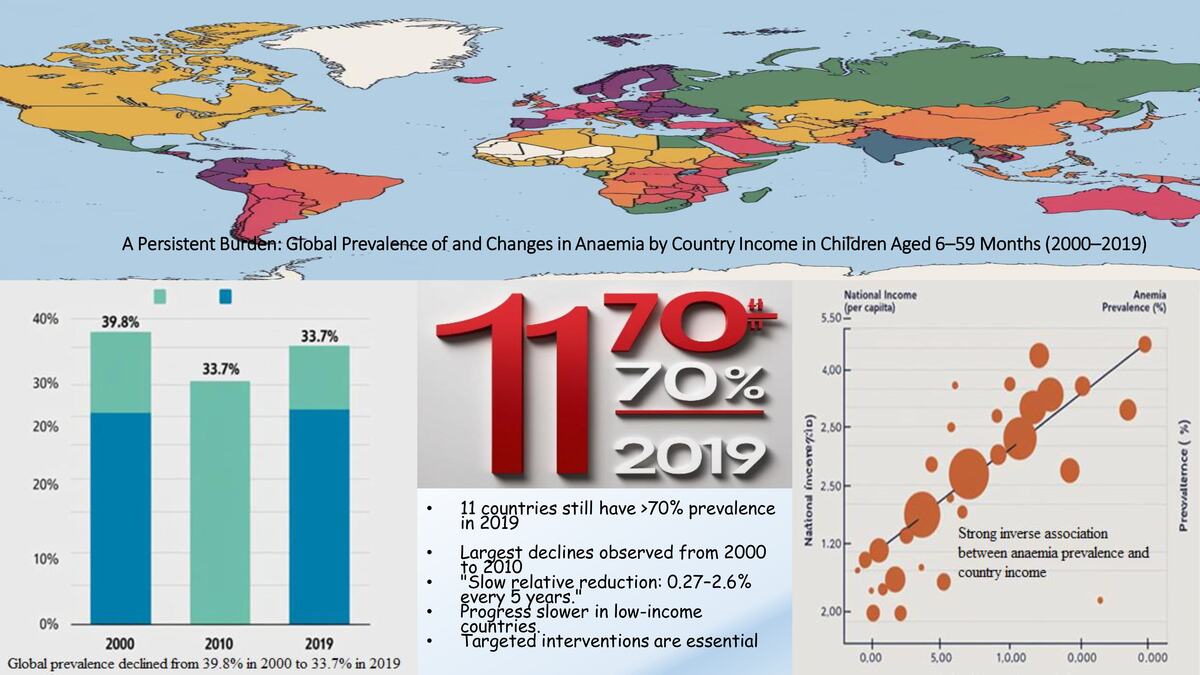 We analysed the prevalence of anaemia among children aged 6–59 months in 189 countries from 2000 to 2019 using data collected by the World Health Organization (WHO). We compared this prevalence with the income earned by each country in 2022. Finally, we calculated the changes in each country’s anaemia burden throughout the study period.