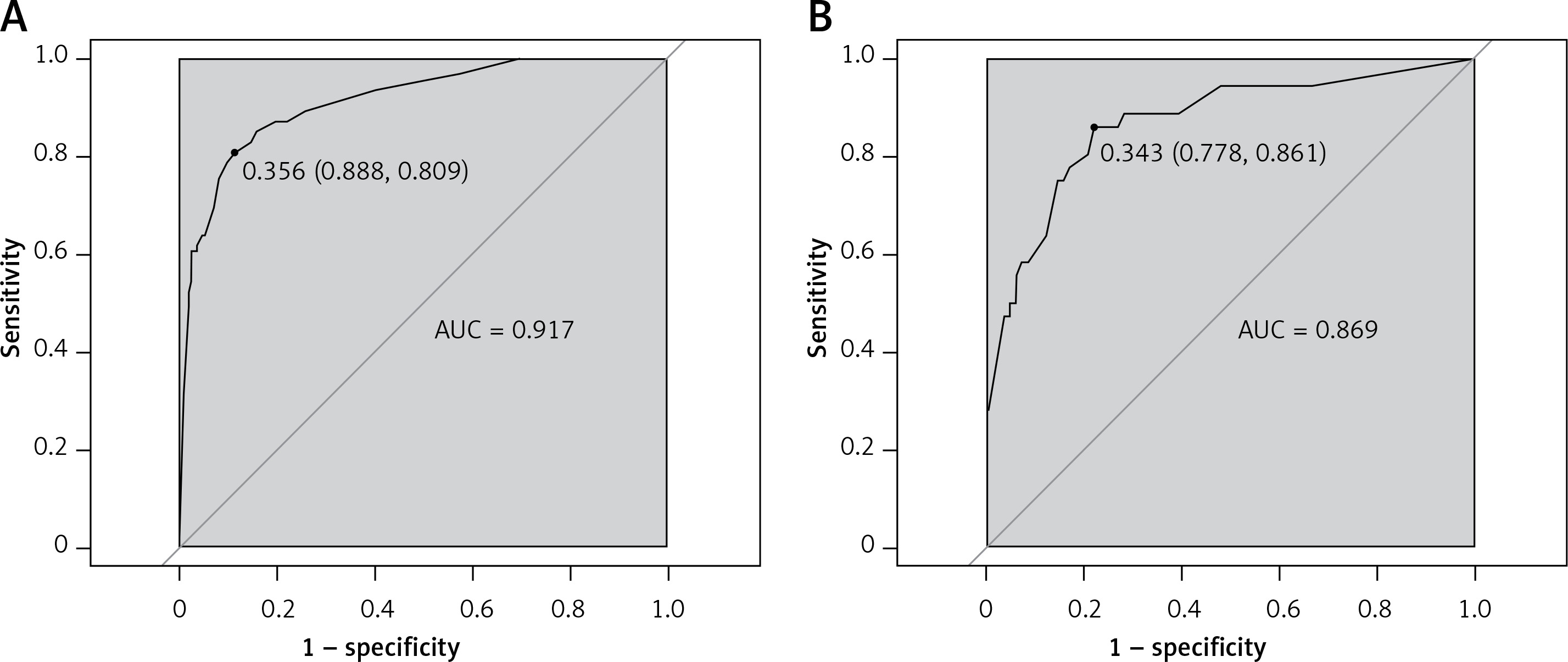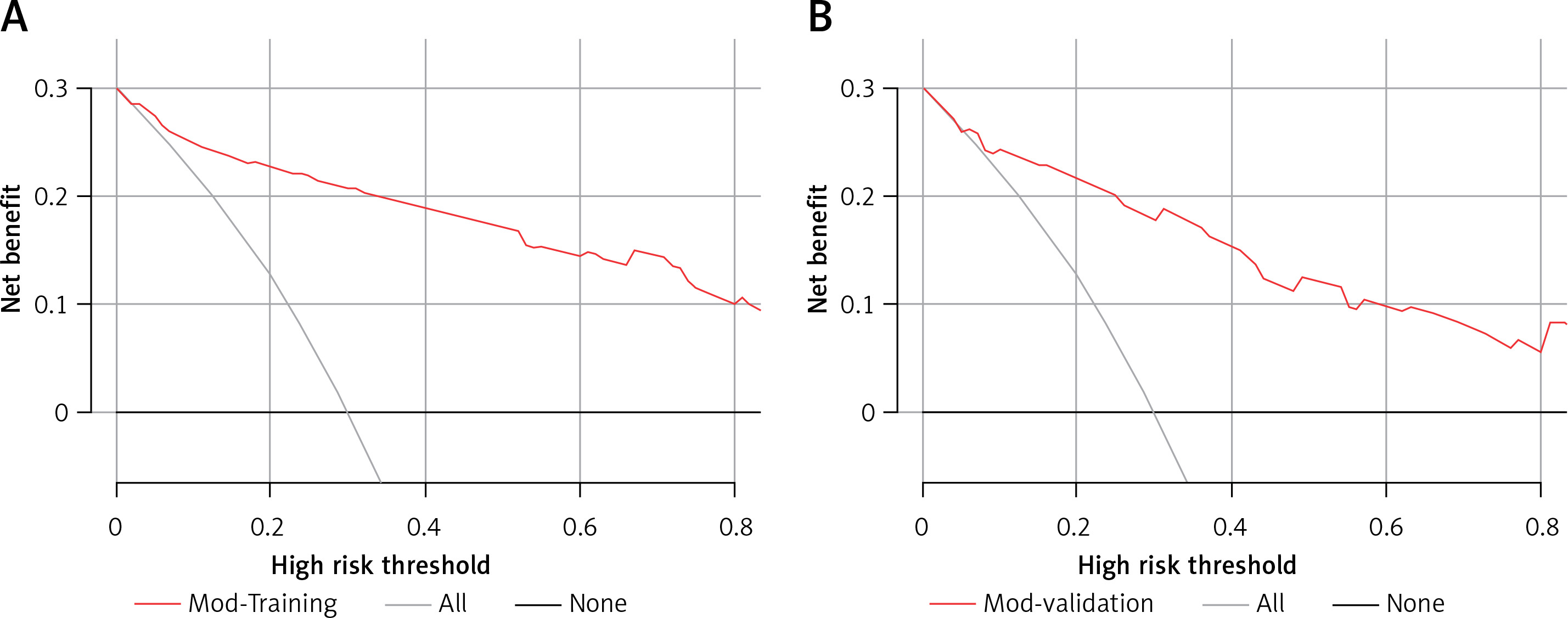 A predictive nomogram for PPDM-A (Figure 2) was constructed based on the above independent risk factors determined by multivariate logistic regression analysis. Simultaneously, a prediction model was built: Logit (P) = -–.837 + 0.947 × CVAI(0/1) + 1.761 × GLU(0/1) – 1.837 × AMY(0/1) + 3.041 × RAP(0/1) + 1.284 × MSAP + 1.355 × SAP/CAP. In the training cohort, the area under the curve (AUC) was assessed at 0.917 (95% CI: 0.882–0.952), as shown in Figure 3 A. With a cut-off value of 0.356, the sensitivity and specificity were identified to be 0.888 and 0.809 respectively, and the 10-fold cross-validation κ was calculated to be 0.679. The calibration curve was on the brink of the ideal diagonal line (Figure 4 A). Moreover, the decision curve analysis (DCA) results indicated a considerably higher net benefit in the predictive model (Figure 5 A). The nomogram was then validated on an internal validation group of 117 patients. This internal validation estimated the AUC to be 0.869 (95% CI: 0.793–0.944), thereby confirming the good accuracy of the nomogram. The model also demonstrated excellent consistency, with the calibration curve of the validation group closely adhering to the ideal diagonal line (Figure 4 B). The DCA also underscored the significant net benefit of the prognostic model (Figure 5 B). The Hosmer-Lemeshow test indicated a good fit for both the training (p = 0.860) and validation cohorts (p = 0.592). Lastly, the variance inflation factor (VIF) confirmed that there was no collinearity between variables in the final model (VIF ≤ 2).