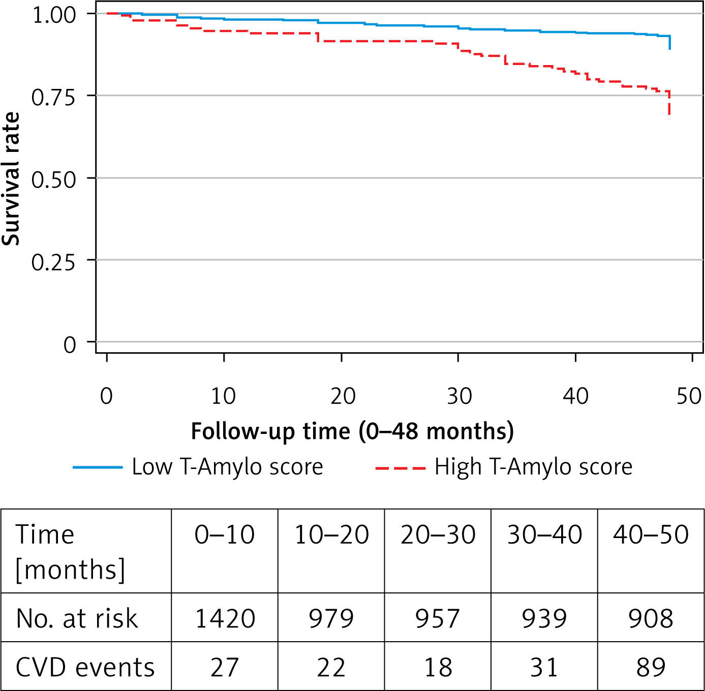 Kaplan-Meier survival plot of T-Amylo score (high, ≥ 6/11 vs. low, < 6/11) for combined CVD events (fatal or non-fatal) during the 4-year follow-up (48 months) of n = 1,420 middle-aged and older participants of the Ikaria Study