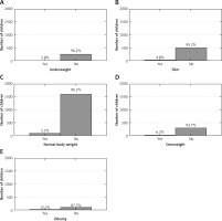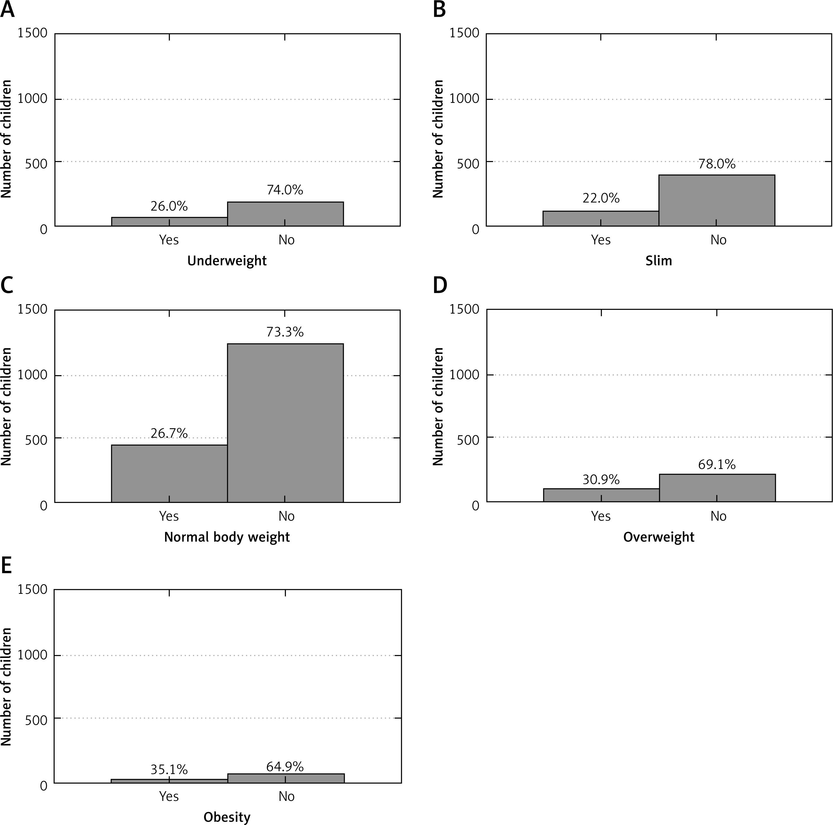 Body mass index was calculated from self-reported weight and height measurements of the participants. The BMI was calculated by dividing the body mass in kilograms by the square of the body height in meters. Overweight and obesity were determined on the basis of the percentile categories according to current reference charts for Polish children correlated by body weight and height [8, 9]. The participants were divided into five groups according to current reference charts for Polish children correlated by body weight and height: 1) underweight; 2) slim; 3) normal body weight; 4) overweight; and 5) affected by obesity.