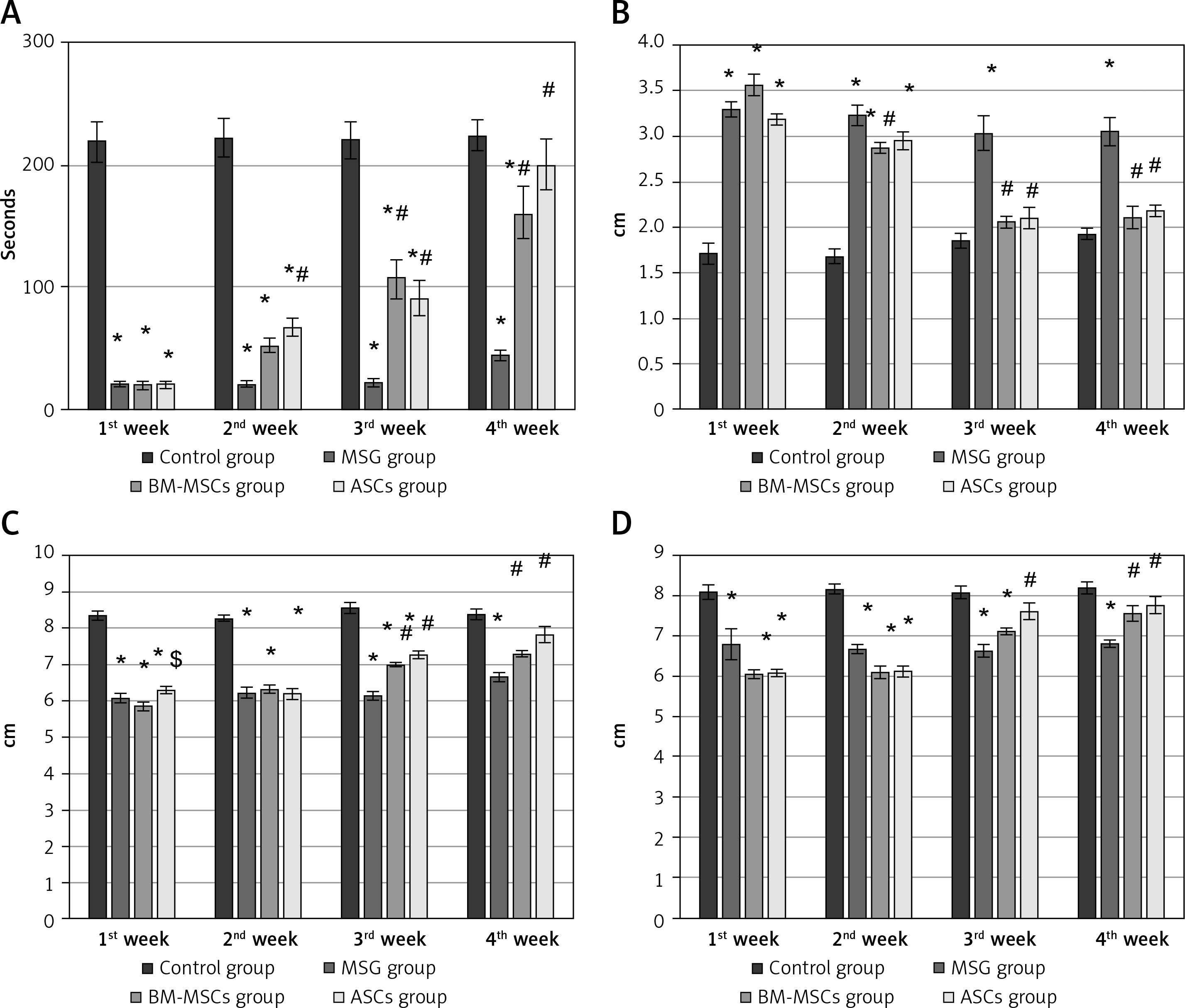 The motor performance in rotarod test and quantitative gait analysis. Rats were observed for time spent on a rotating rode (A), stance width (B), fore-limb stride length (FSL) (C), and hind-limb stride length (D). The monosodium glutamate group showed deterioration compared to the control group started at the first week. Adipose tissue stem cells group showed significant improvement in time spent in rotarod test started at the second week and all gait parameters started at the third week. Bone marrow mesenchymal stem cells group showed significant increase in time spent in rotarod test and FSL started at the third week, stance width in the second week, and hind limb stride length started at the fourth week. Mean ± SEM were analysed using one-way analysis of variance and Tukey post-hoc test