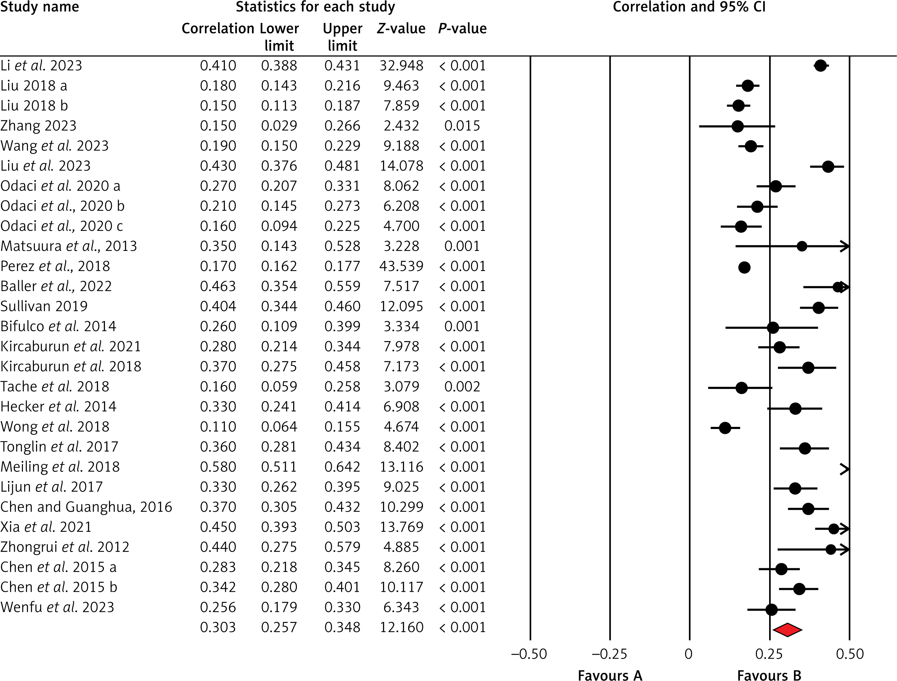 Of the 24 studies, 22 reported correlation coefficients, while two reported standardized regression coefficients; these were converted to correlation coefficients using the formulas r = 0.98β + 0.05 (for β ≥ 0) and r = 0.98β (for β < 0). Final study details are presented in Supplementary Table SI.