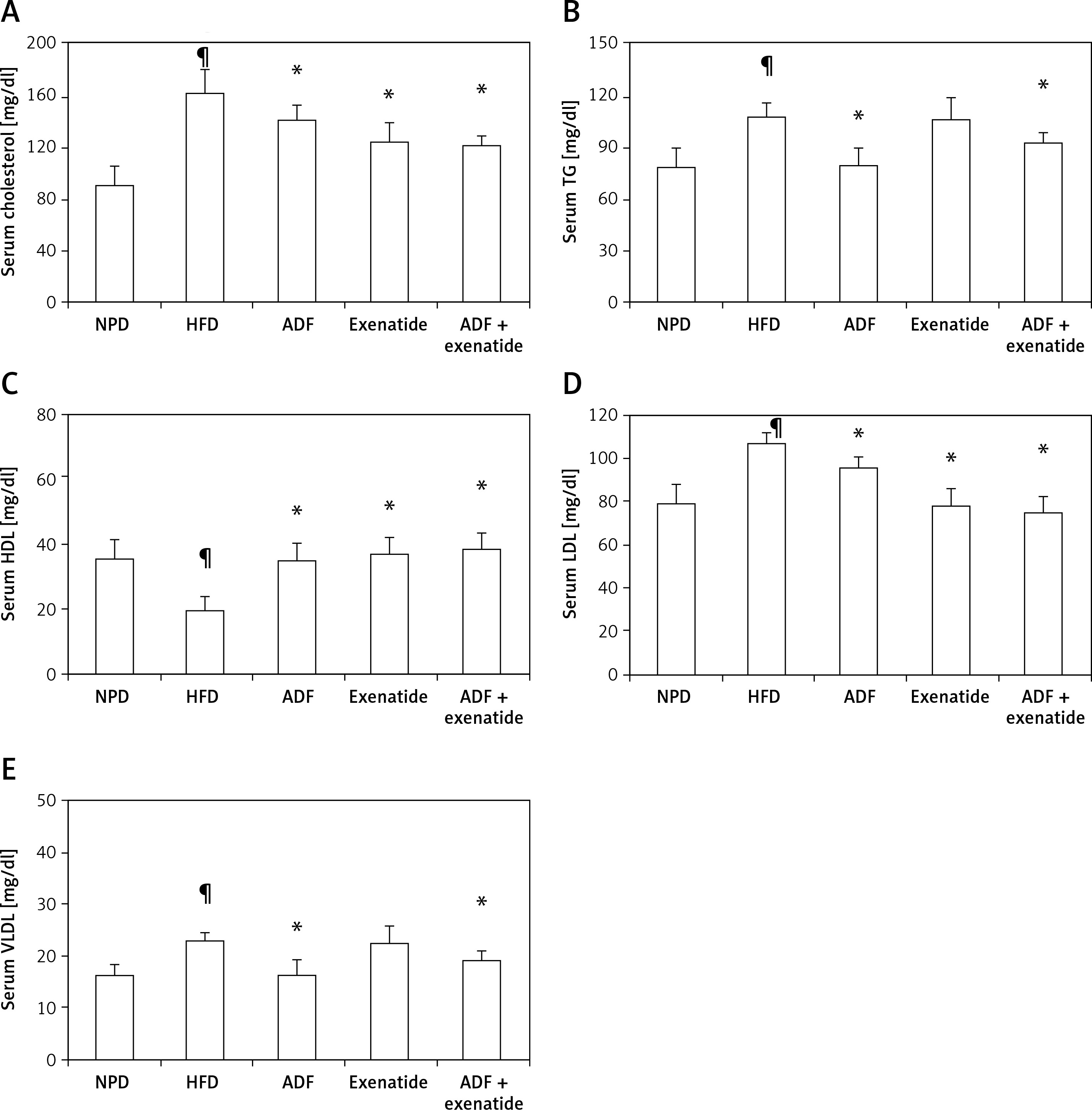 Figure 2 shows a significant increase in the lipid profile parameters TC, TG, LDL, and VLDL but a decrease in HDL in the HFD group compared to NPD treatment with ADF alone and the combined ADF + exenatide had reduced elevated lipid profile parameters and normalized HDL compared to the HFD group (p < 0.05). The same significant effect on TC, HDL, and LDL levels was also exerted by exenatide treatment (p < 0.05).