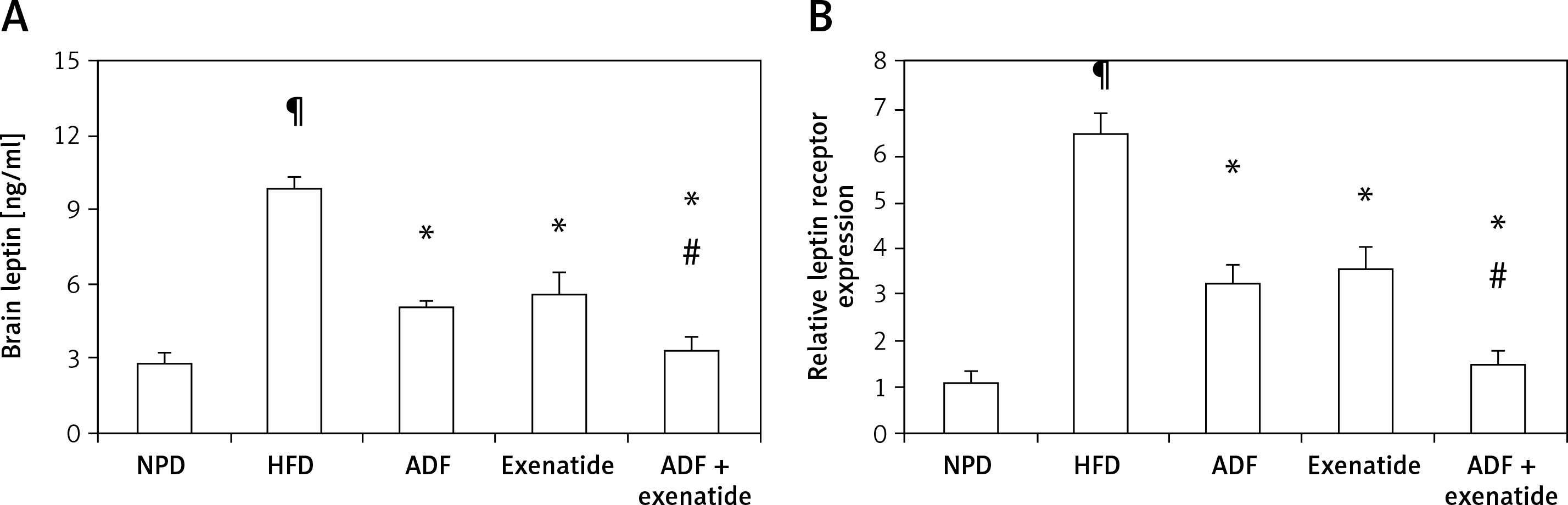 Effect of ADF and/or exenatide on brain leptin content and receptor expression in HFD-induced obesity in mice. High calorie fed obese mice showed HFD-enhanced brain leptin level and receptor expression. A – ELISA detected leptin “ng/ml”, B – qRT-PCR, relative expression of leptin receptor gene in HFD-induced leptin resistance in mouse brain. Values are mean ± SD (n = 10), analyzed by one-way ANOVA followed by Tukey’s multiple comparisons test. ¶,*,#p < 0.05; ¶compared with NPD control group, *compared with HFD control group, #compared with exenatide treated group