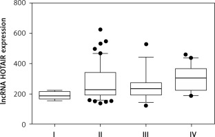 The high expression of HOTAIR was significantly associated (p = 0.0075) with advanced stages of endometriosis (Table IV). With regard to the classification of endometriosis (stage), there was a statistically significant increase in HOTAIR expression in stage IV compared to stages I, II, and III, with p < 0.05 in all 3 cases (Figure 3).
