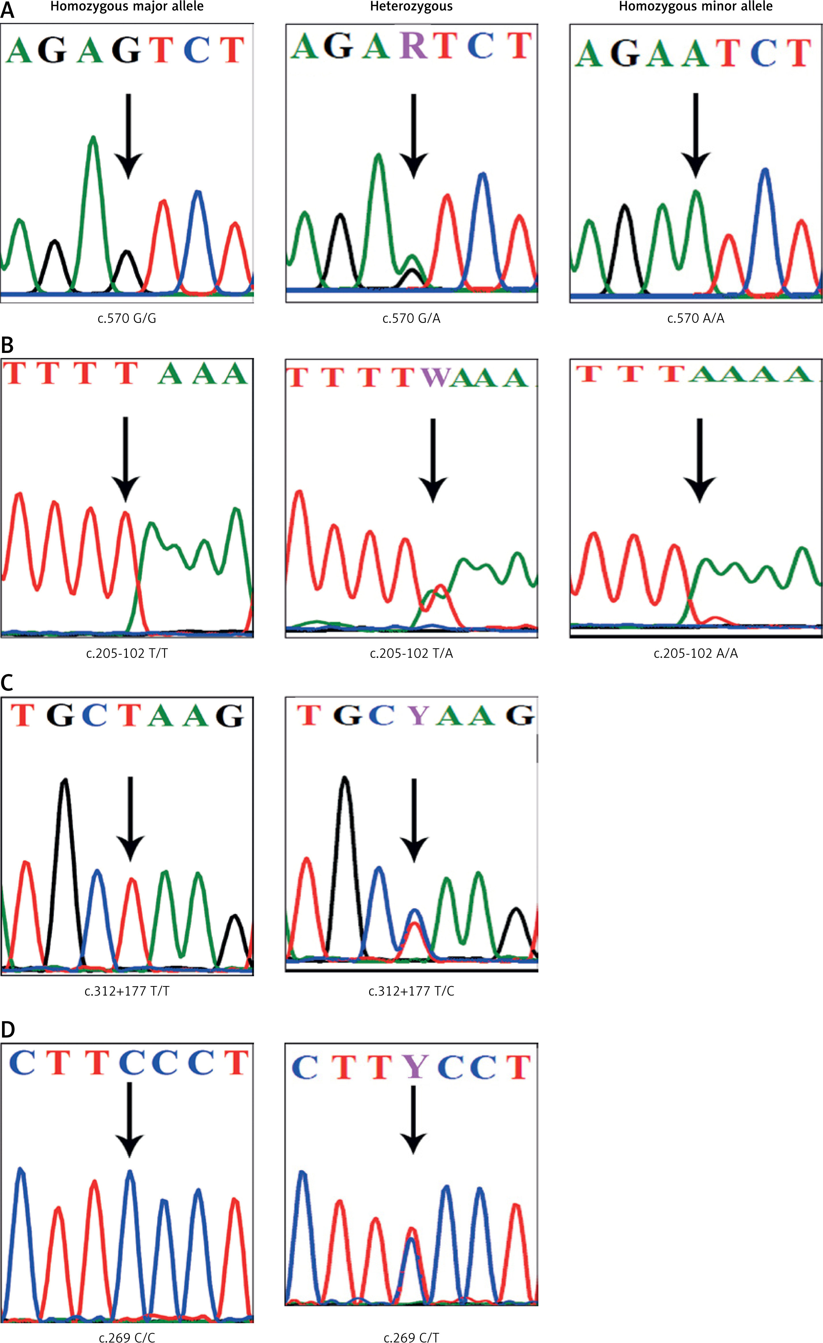 ABI sequenced chromatograms showing the detected PRL variants. A – c.570 G>A, B – c.205-102 T>A, C – c.312+177 T>C, D – c.269 C>T