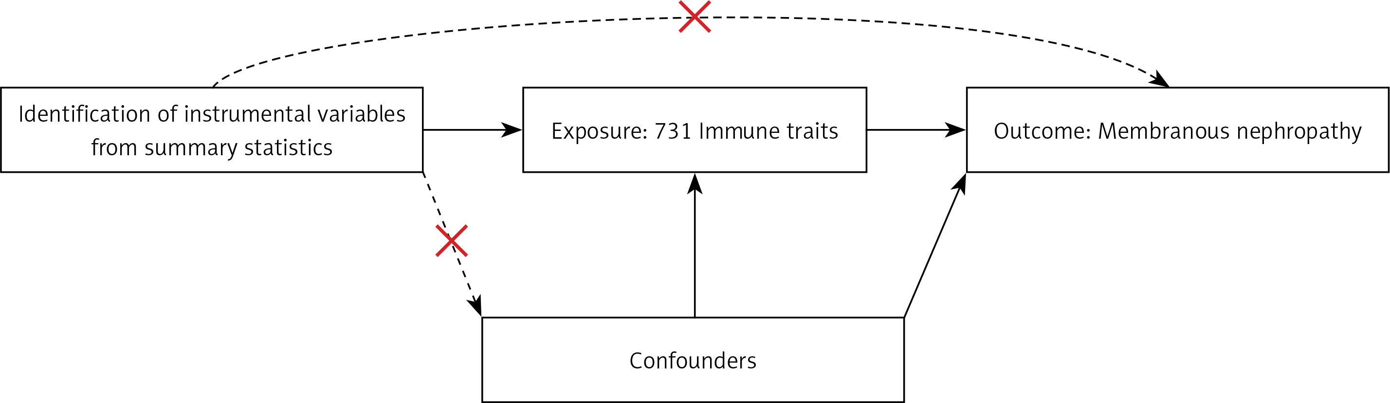 This study employed summary statistics derived from previous genome-wide association studies (GWAS) conducted on immune traits [14]. Due to the nature of the data used, neither ethical approval nor participant consent was deemed necessary. The comprehensive investigation encompassed a wide range of 731 immunophenotypes, comprising absolute cell counts, median fluorescence intensities, morphological parameters, and relative cell counts. To ensure the robustness of the analysis, rigorous adjustments were performed, taking into account important factors such as age and sex, and assessing their correlations. To minimize potential bias arising from population stratification, only individuals of European descent were included in the study [14]. The genetic summary statistics specific to MN were derived from a GWAS conducted on cases and controls of European ancestry. A total of 2150 cases of primary MN were detected by renal biopsy, eliminating suspected cases caused by autoimmune diseases, medications, infections, or malignant tumors. The control group in the German chronic kidney disease (CKD) cohort consists of 5,829 individuals who do not have MN [15]. The study design, including the key components and procedures, is visually depicted in Figure 1, providing a clear overview of the study’s structure and methods. Summary data of MN are publicly available in the IEU Open GWAS database (https://gwas.mrcieu.ac.uk/). The information of data sources is illustrated in Table I.