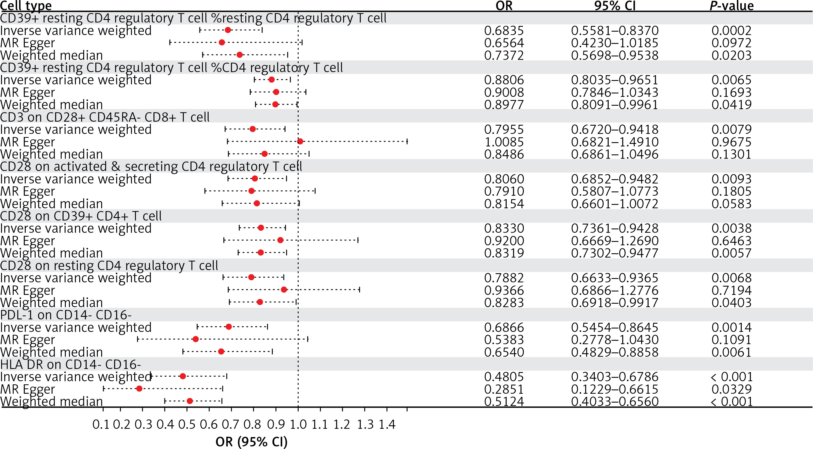 Additionally, the IVW analysis results for CD28 on CD39+ CD4+ T cell (OR = 0.8330, 95% CI: 0.7361–0.9428, p = 0.0038), PDL-1 on CD14- CD16- (OR = 0.6866, 95% CI: 0.5454–0.8645, p = 0.0014) and HLA DR on CD14- CD16- (OR = 0.4805, 95% CI: 0.3403–0.6786, p < 0.0001) also consistently indicate a negative correlation with MN. The results of the weighted median analysis were also consistent with those of the IVW method. MR-Egger investigations found no horizontal pleiotropy (Supplementary Table SIV).