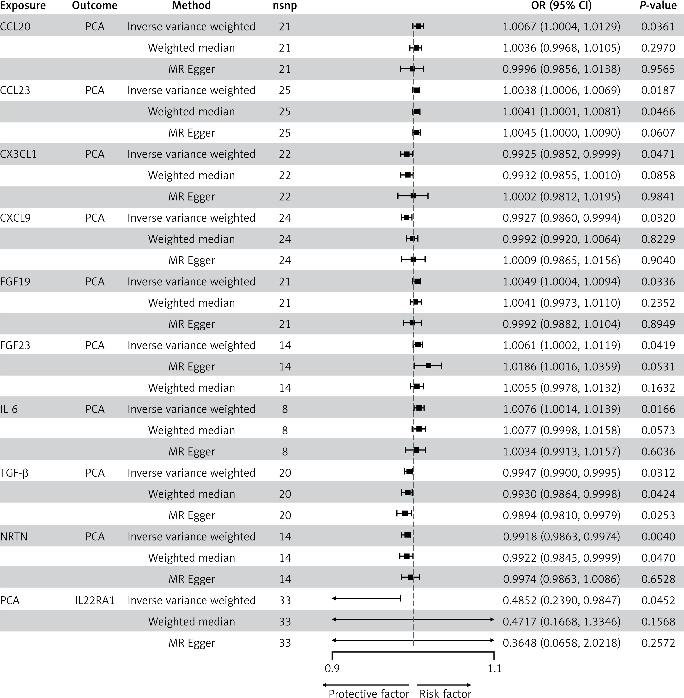 C-C motif chemokine 20 levelsCCL20Prostate cancerPCAInverse variance weighted210.03611.0067 (1.0004, 1.0129)0.03420.02890.2920True