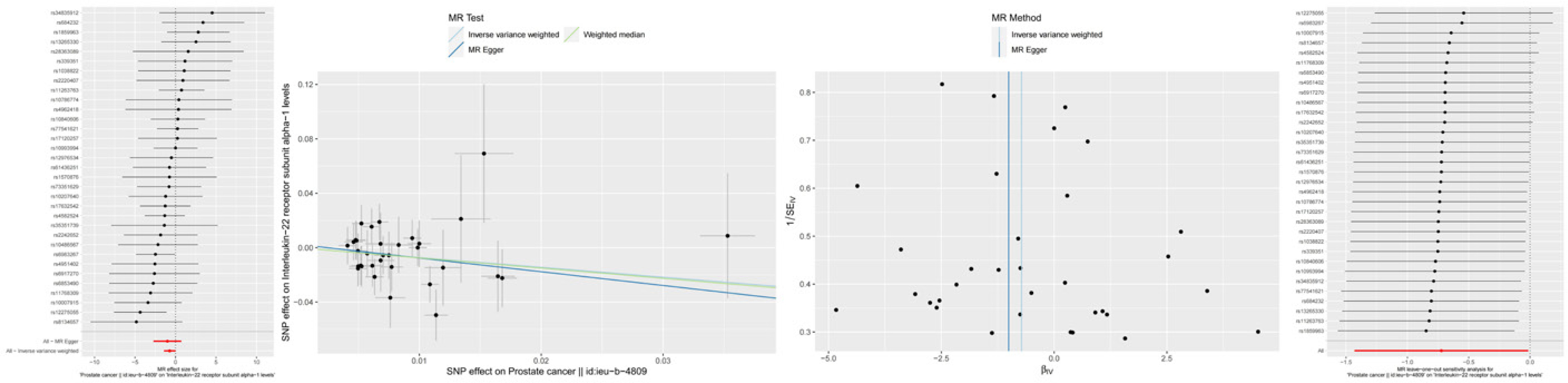 Our findings from reverse MR analysis indicate that PCa may be associated with a decrease in the inflammatory level of IL-22RA1. Interleukin-22 (IL-22) is a member of the IL-10 cytokine family and is produced by T cells and innate lymphoid cells. The IL-22 signaling pathway plays a crucial role in coordinating mucosal immune defense and tissue regeneration. Its pleiotropic actions include pro-survival signals, cell migration, developmental anomalies, and angiogenesis [24]. These functions contribute to the prevention of initial tumor formation. The involvement of the IL-22/IL-22RA1 axis in cancer is intricate. Evidence suggests that IL-22 expression and signaling are dysregulated in patients with various common cancers such as intestinal, skin, lung, and liver cancer. Although IL-22 displays limited tissue specificity, its receptor IL-22R1 is exclusively expressed on epithelial and tissue cells. Nonetheless, it is an attractive therapeutic target on immune cells due to its potential to achieve anti-tumor immunity with reduced side effects [24]. Our study further supports this notion by demonstrating that PCa occurrence is associated with a decrease in the inflammatory level of IL-22RA1, thereby highlighting it as a promising therapeutic target.
