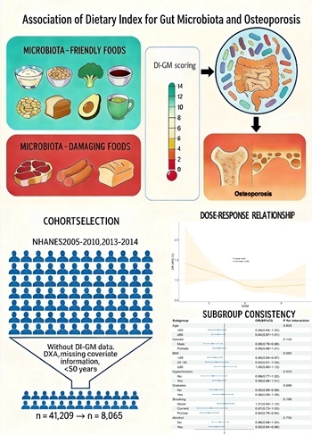 The gut microbiota serves as a critical interface between the host’s internal environment and external factors, influencing bone mass and quality by modulating immune homeostasis, mineral absorption, and the production of systemically active metabolites. In this context, the Dietary Index for Gut Microbiota (DI-GM) provides a valuable metric for quantifying diet quality in relation to microbiota health. Therefore, investigating the association between DI-GM and the risk of osteoporosis (OP) is important for developing evi-dence-based dietary prevention guidelines.
