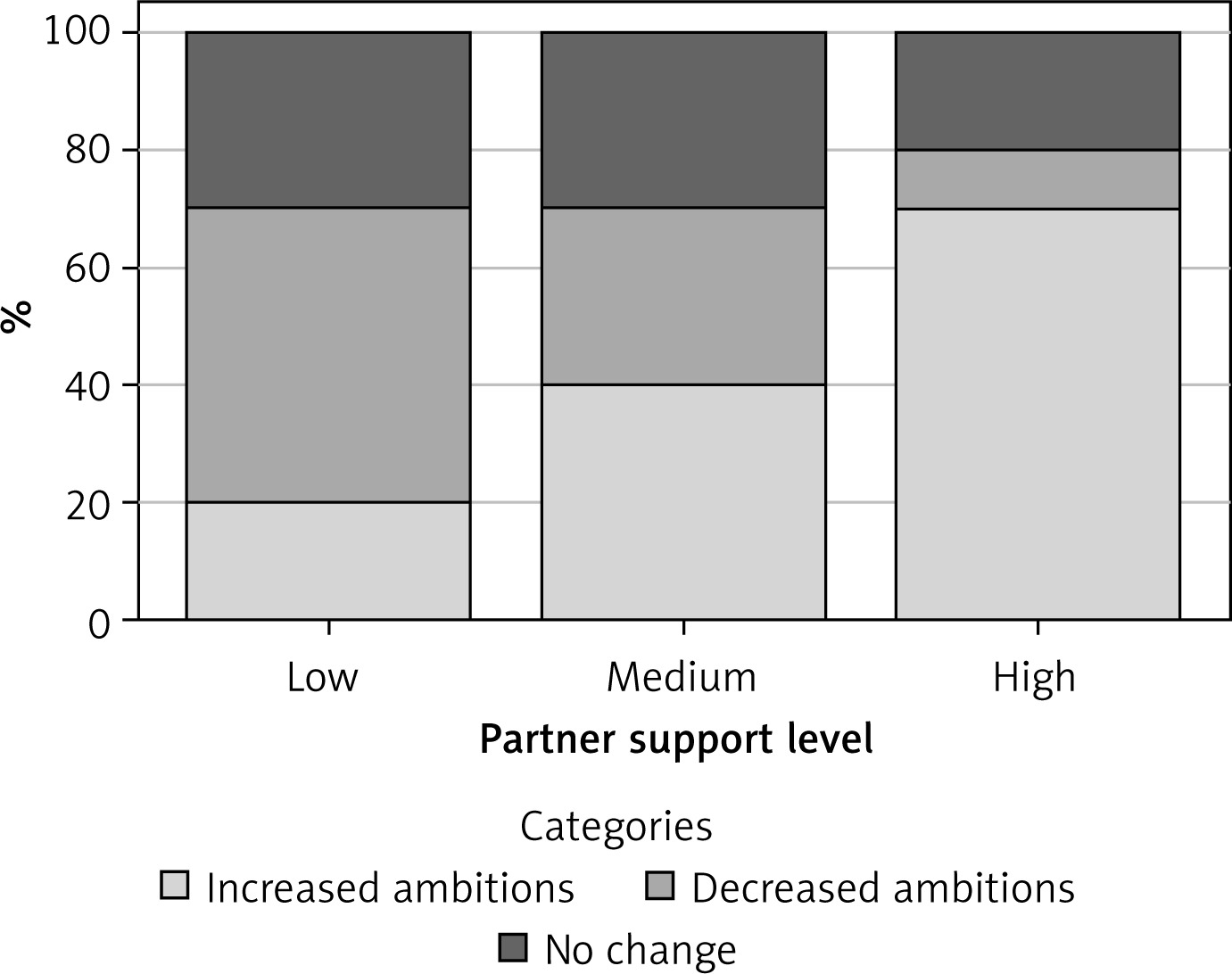 The analysis showed a statistically significant relationship between partner support and declared career ambitions (Figure 1, p < 0.05). Higher levels of partner support were associated with higher career ambitions, while lack of support correlated with a decrease in these ambitions. These results highlight the importance of partner support for women’s career motivation, particularly in the context of motherhood.