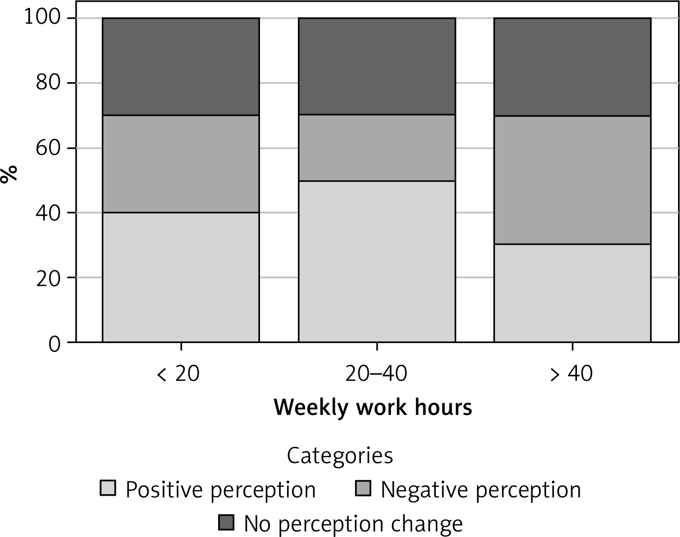 There was no statistically significant relationship between working time dimension, on-call duty and perceived impact of motherhood (Figure 2, p = 1.00). The results indicate that perceptions of maternity may be influenced by other factors, but further analysis is needed to take these aspects into account.