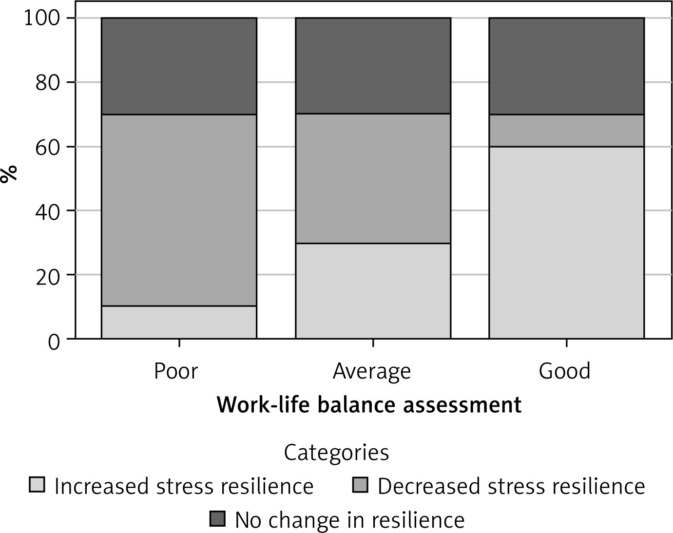 The analysis examined the relationship between ratings of the ability to manage work-life balance (poor, average, good) and declared resilience to stress (increased, decreased, no change). A statistically significant relationship was found between the ability to manage balance and resilience to stress (Figure 4, p < 0.001). The results suggest that individuals with a better assessment of their ability to maintain work-life balance are significantly more likely to report high resilience to stress. This suggests a strong link between life stability and the ability to manage tension, which may be a key factor in maintaining psychological wellbeing in this professional group.