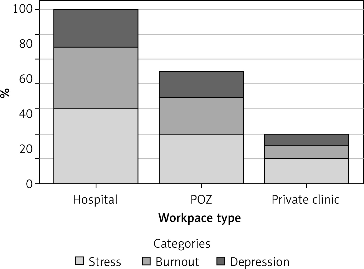 The analysis examined the relationship between type of workplace (hospital, primary care practice [PCP], private practice) and respondents’ reporting of mental health problems, such as exposure to chronic stress, job burnout and depression. Workplace type was significantly associated with job burnout (Figure 5, p = 0.0018). Working in a hospital was associated with a higher risk of stress and burnout compared to working in a PCP or private practice. This relationship may be due to differences in workload, organisational pressures and the specific demands of the work environment. These findings highlight the need for psychological support and preventive measures, especially in the hospital environment.