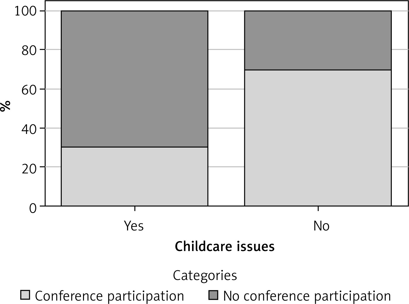 The analysis examined the impact of difficulties in finding childcare on scientific activity, declared as active publication of scientific articles or participation in conferences. Difficulties in securing childcare were significantly associated with reduced scientific activity (Figure 6, p < 0.05). Lack of access to care correlated with fewer scientific publications and lower conference attendance. These results highlight the importance of access to childcare support for active mothers, especially those involved in scientific research.