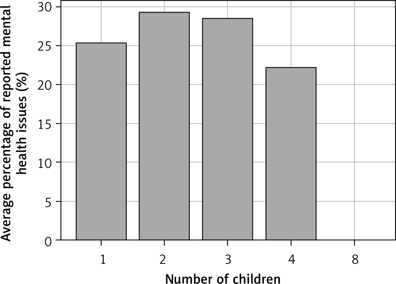 The highest proportions of mental health problems were reported by mothers with 2 (29.4%) and 3 children (28.6%), slightly less by mothers with 1 (25.4%) child. The lowest percentage of problems was found in mothers with 4 (22.2%) children, although the number of observations was small. Mothers with more children (4 or more) reported fewer mental health problems, which may indicate a better adaptation to multitasking as well as higher levels of social and family support. However, the group is not representative, and therefore research needs to be conducted with a larger group of respondents to draw further conclusions.