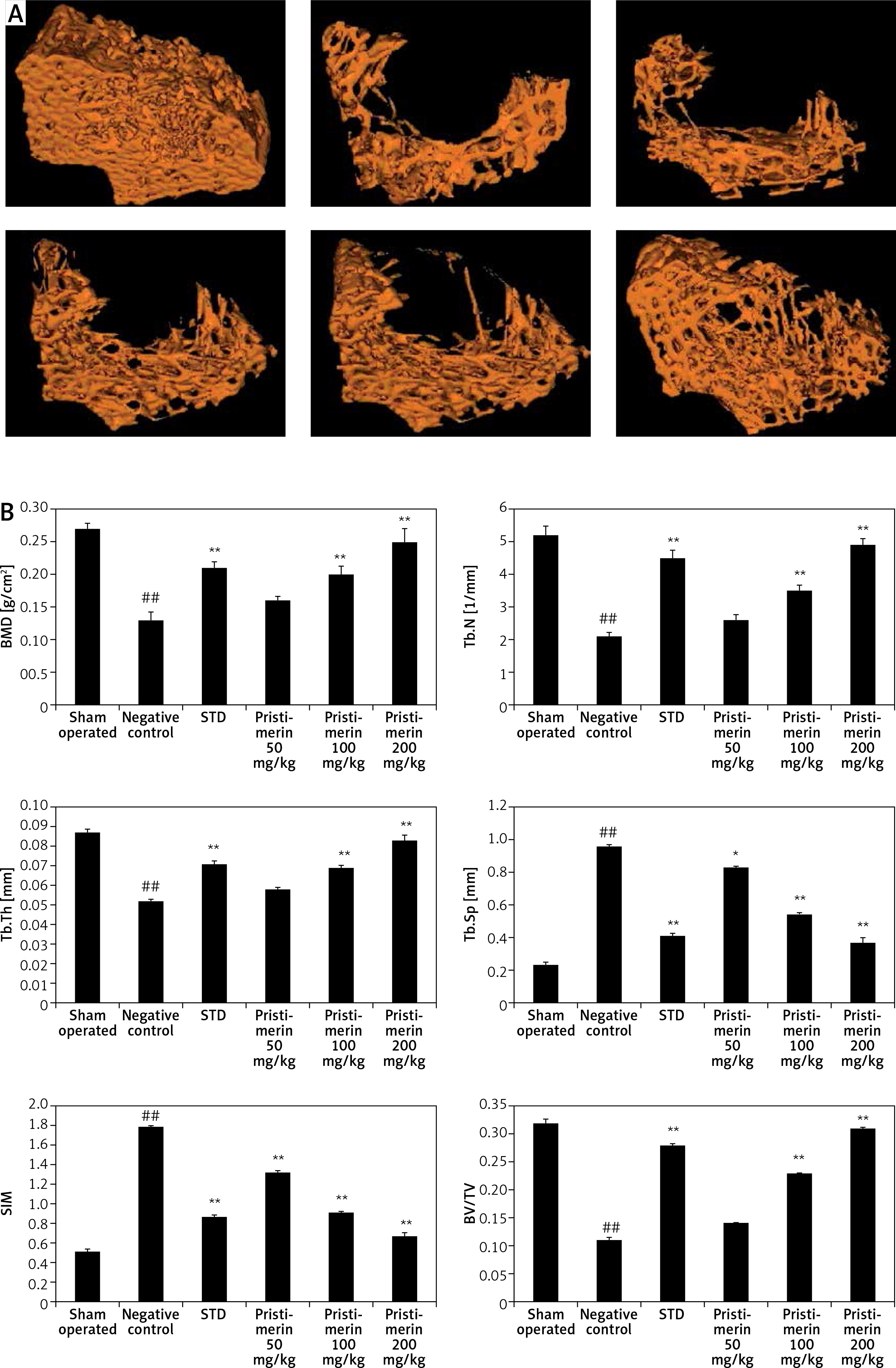 Figure 3 shows the effects of pristimerin on bone microarchitecture. There was a significant (p < 0.01) decrease in BMD tubular number, tubular thickness, and BV/TV in the bone tissues of negative controls compared to controls. However, SIM and tubular separation in the bone tissue increased in negative controls compared to controls. Treatment with alendronate and pristimerin attenuated the changes in markers of bone microarchitecture such as BMD, Tb.N. Tb.Th, Tb.Sp, SIM, and BV/TV.