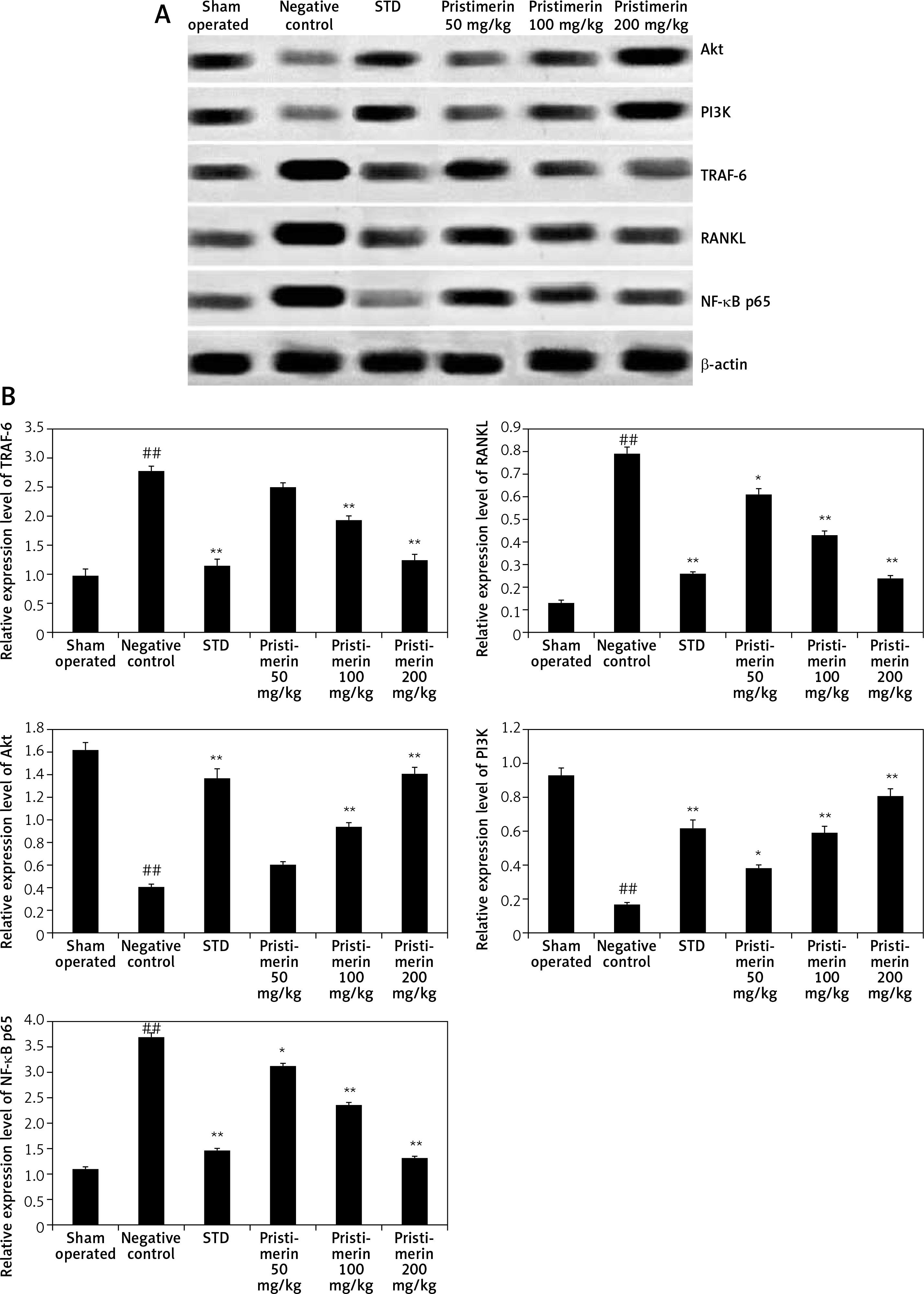 The effects of pristimerin on the expression levels of Akt, PI3K, RANKL, NF-κB p65, and TRAF-6 in bone tissue are shown in Figure 4. The expression levels of TRAF-6, NF-κB p65, and RANKL were significantly increased (p < 0.01), and the expression levels of Akt and PI3K were significantly reduced, in negative controls compared to the sham group. Treatment with pristimerin significantly reversed both trends.