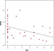 Pearson’s correlation test was used to assess the correlations between RDI as an indicator of SDB and anthropometric parameters. Table II and Figure 2 show a significant negative correlation between RDI and BDNF serum level and a significant positive correlation between RDI and anthropometric indices of obesity (BMI, WC, WC/Ht ratio, HC, NC, NC/Ht ratio).