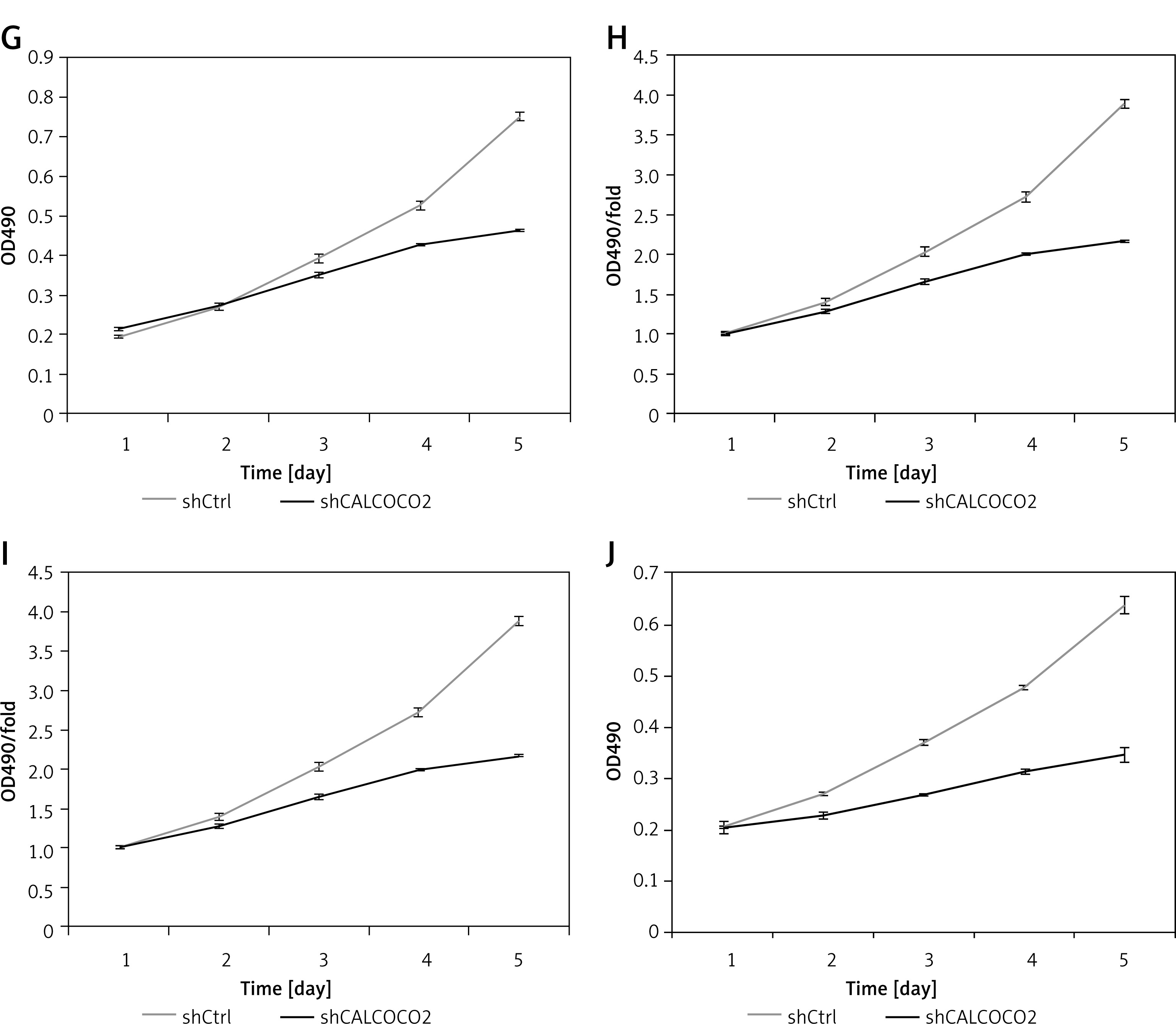 As shown in Figure 2 A, CALCOCO2 silencing significantly inhibited U87 cell growth compared to that of the shControl group (p < 0.05). The cell counting results showed that the proliferation fold change values for the shCALCOCO2 group in the U87 cell line at days 4 and 5 were 2.8 ±0.07 and 4.1 ±0.11, respectively, which were obviously lower than those for shControl cells (4.13 ±0.05 and 6.42 ±0.2, respectively). Similarly, there was a significant difference in cell counts between the shCALCOCO2 and shControl groups in the U251 cell line, especially on days 4 and 5, indicating the inhibitory effect of CALCOCO2 silencing on cell growth. An MTT assay also showed that both U87 and U251 cells exhibited slower proliferation and growth after the silencing of CALCOCO2, and these effects were even more pronounced on day 5, when the proliferation fold changes in the shCALCOCO2 group were 2.163 ±0.0068 and 1.696 ±0.0672 in U87 and U251 cells, respectively, while the proliferation fold changes in the shControl group were 3.882 ±0.0547 and 3.117 ±0.0793, respectively.