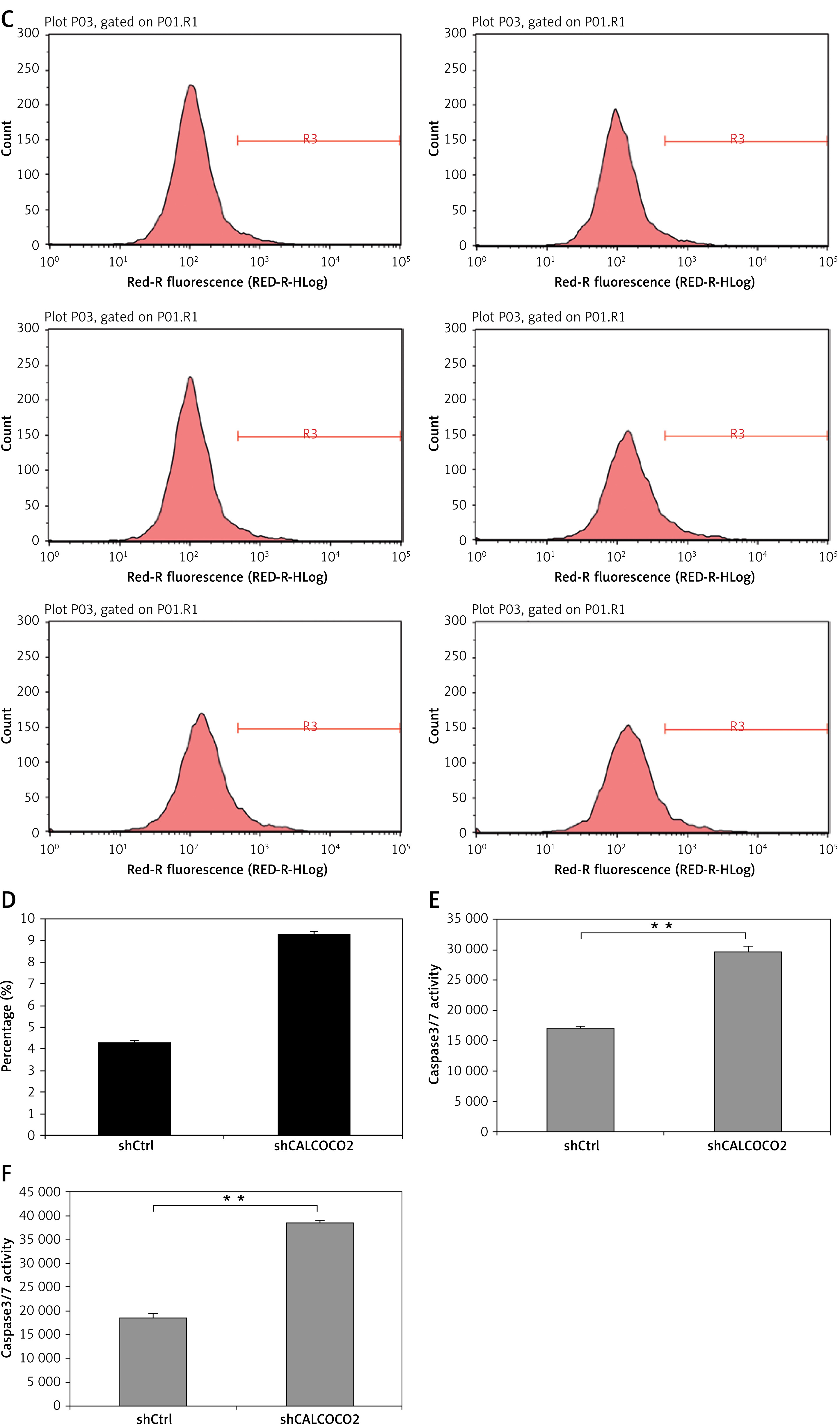 Caspase-Glo 3/7 reagent was prepared by mixing caspase-Glo 3/7 with the substrate and was then stored at 4°C. Cells transfected with shCALCOCO2 or shControl at the logarithmic phase were seeded on 96-well plates at a density of 4000 cells/well and then cultured for 1, 2, 3, 4, or 5 days. The caspase-Glo 3/7 reagent was added to the cells at an amount equivalent to the volume of the culture, shaken for 30 s, and cultured for 0.5–3 h at room temperature according to cell conditions. The fluorescence of each well was assessed using a microplate reader.