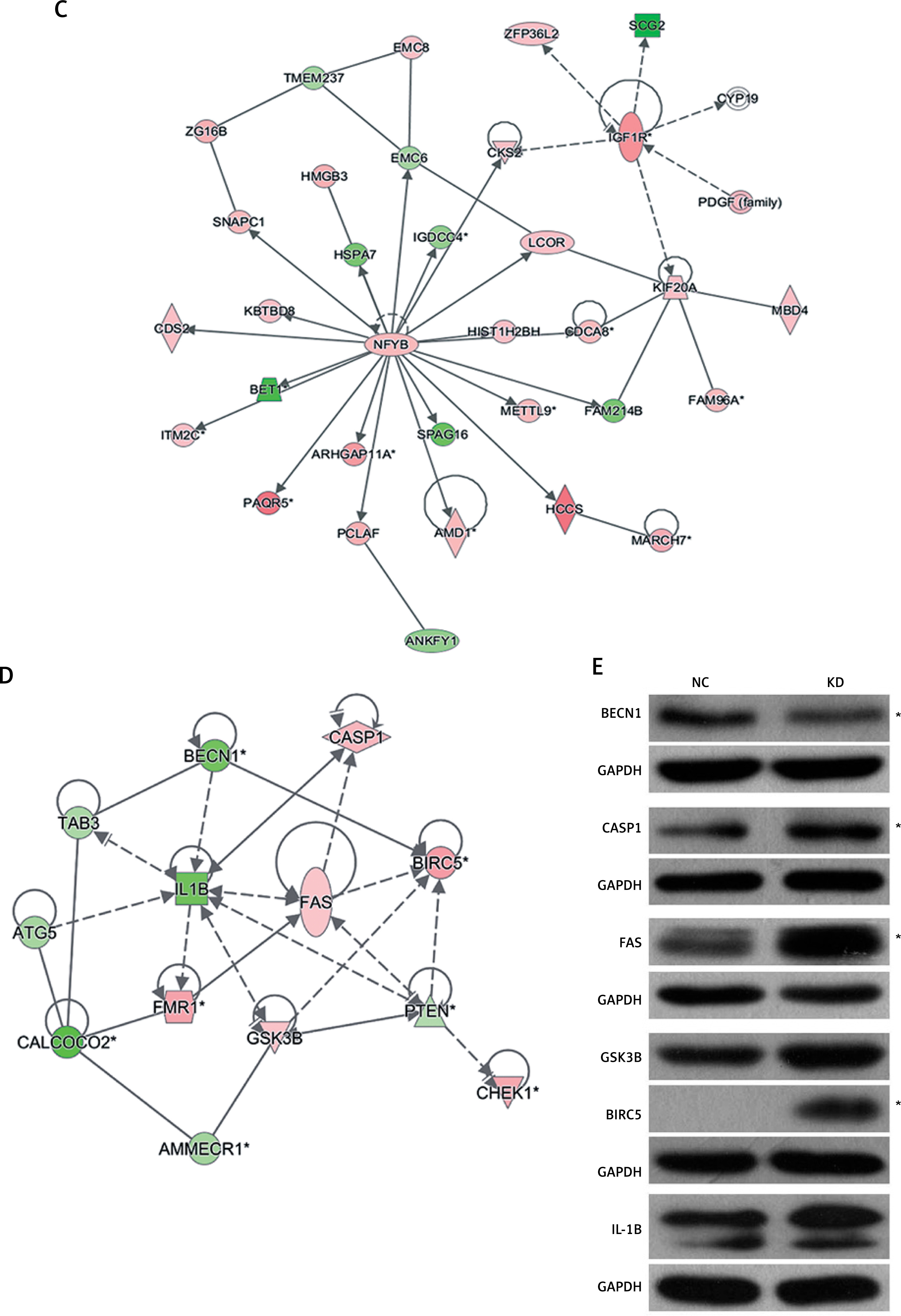 In the gene microarray analysis, there were 586 differentially expressed genes, including 357 genes that were downregulated and 229 genes that were upregulated (Figure 4 A). These discriminative genes were functionally analysed by IPA. As shown in Figure 4 B, 17 CALCOCO2-related functions and diseases were detected by IPA, and infectious diseases, cancer, organismal injury, and abnormalities were the highest ranked categories. The gene interaction network confirmed these results (Figure 4 C). The silencing of CALCOCO2 markedly upregulated CASP1, FMR1, GSK3B, BECR5, CHEK1, and FAS and downregulated the other loci (Figure 4 D). The expression levels of BBECN1, CASP1, FAS, GSK3B, BIRC5, and IL-1β were further analysed by western blotting (Figure 4 E).