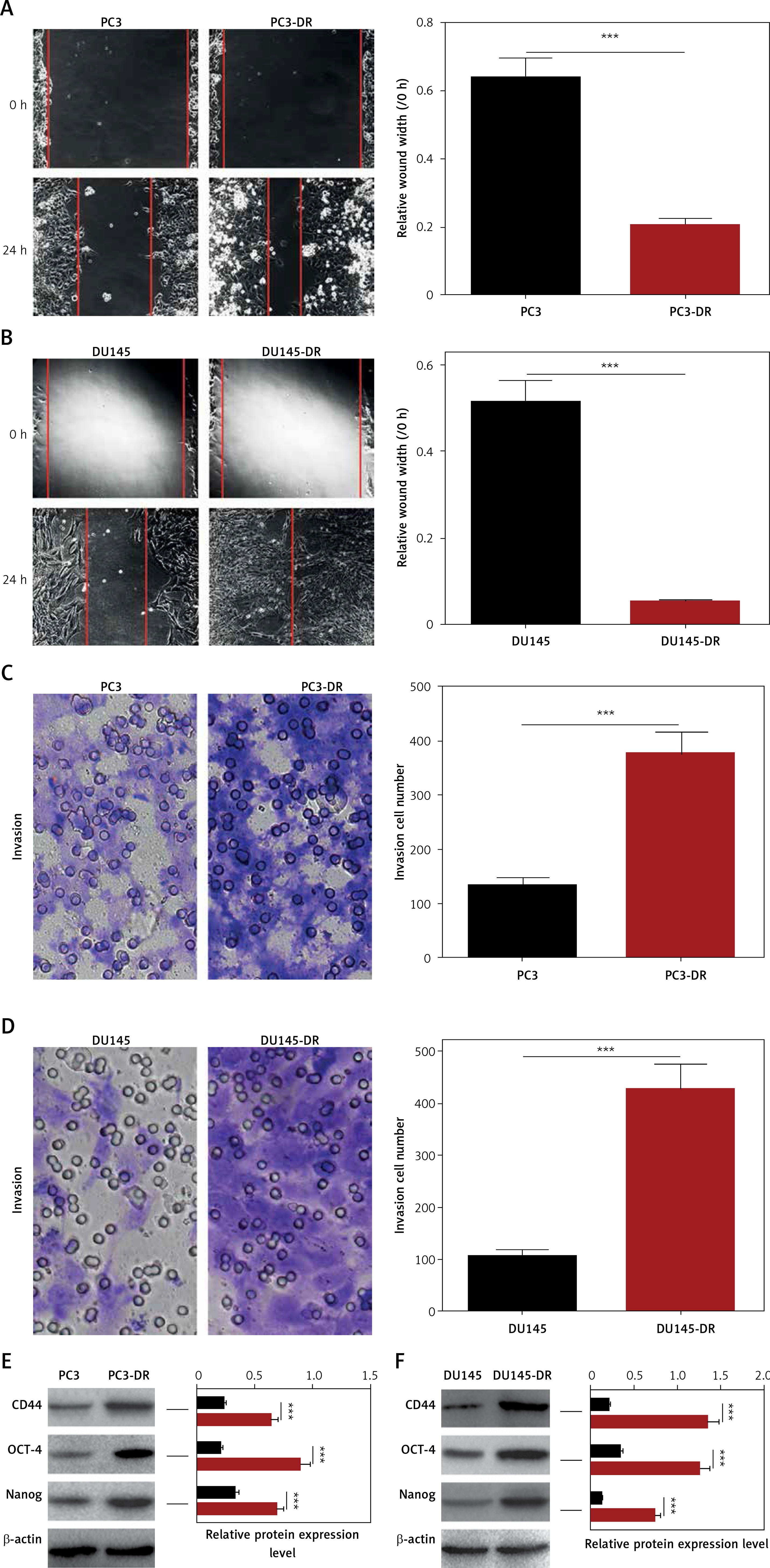 Dox-resistant prostate cancer cells exhibited cellular malignant phenotype. A, B – Cell migration was evaluated by wound-healing assay. C – Cell invasion was examined by transwell assay. D – Cell invasion was examined by transwell assay. E, F – Protein levels of CD44, OCT-4 and Nanog were detected by western blotting