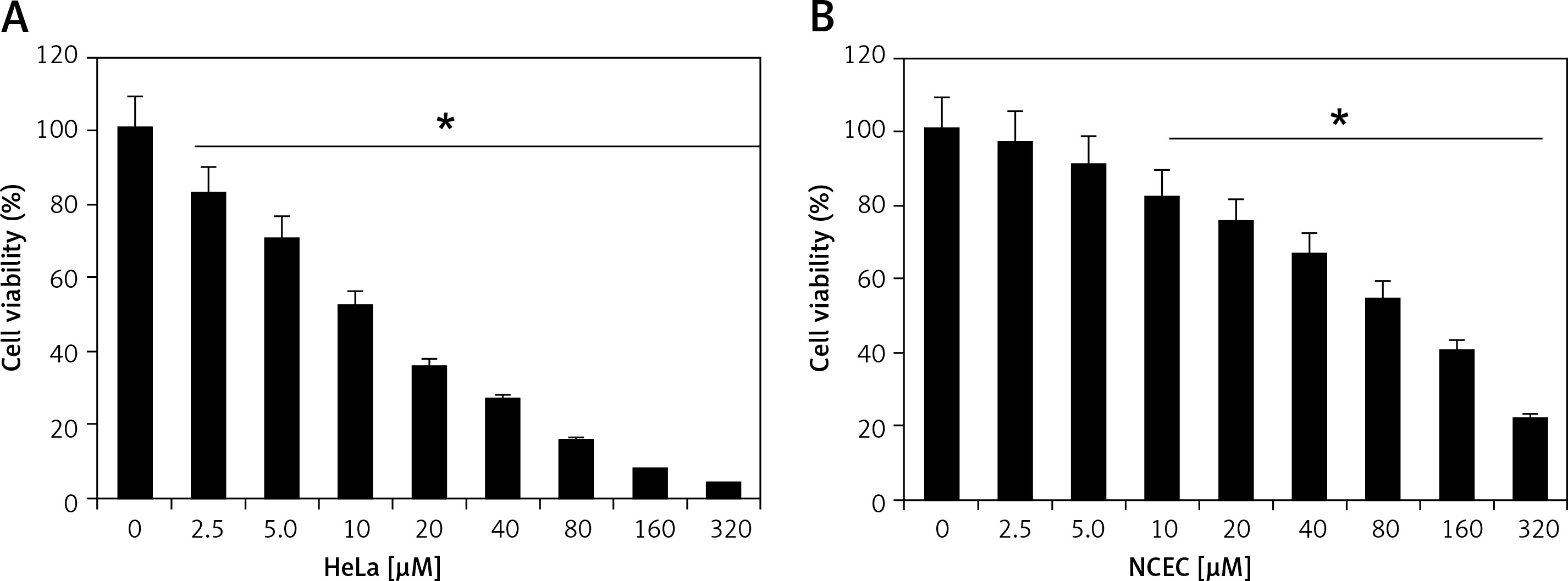 Camelliol C exerts inhibitory effects on the viability of the cervical cancer cells, as ascertained by MTT assay. The normal NCEC and four different types of cervical cancer cell lines (Caski, HeLa, C33A, and siHa) were treated with 0–320 µM concentrations of camelliol C for 24 h, and the proliferation rates of cells were determined. It was found that the viability of all the cervical cancer cells decreased proportionally with the increasing doses of camelliol C with IC50 ranging from 10 to 20 µM (Table I, Figure 1 A). Surprisingly, the effects of camelliol C on the normal cells were less severe, as shown by the IC50 of around 90 µM (Figure 1 B). Because the lowest of IC50 of 10 µM was observed against the HeLa cells, this cell line was selected for further investigation.