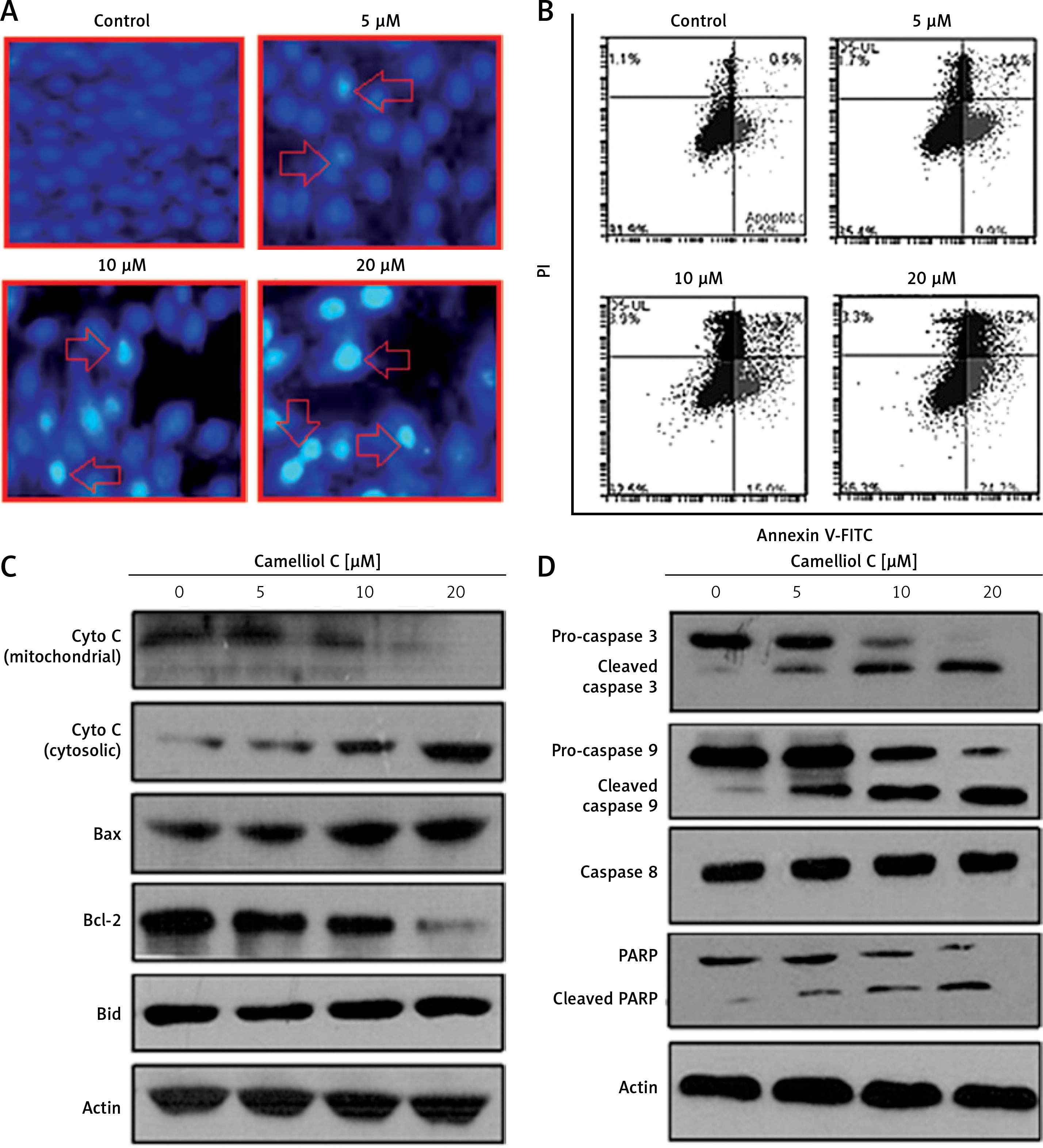 Camelliol C induces apoptosis in cervical cancer cells. DAPI (A) and annexin V/PI (B) staining of camelliol C-treated HeLa cells, showing induction of apoptosis. Western blots of Cyto C, Bax, Bcl-2, Bid (C), and caspase-3, -9, and -8 and PARP (D). The experiments were performed in triplicate
