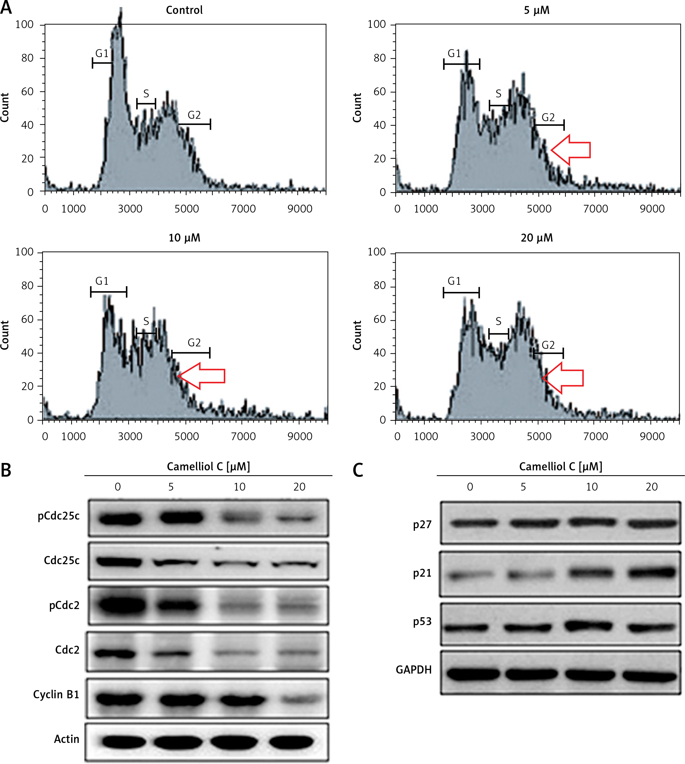 Camelliol C induces G2/M cell cycle arrest in cervical cancer cells. A – Flow cytometry showing the effect of camelliol C on the cell cycle distribution of HeLa cells. B – Western blots showing the effect of camelliol C on Cdc25 c and Cdc2 phosphorylation. C – Western blots showing the effect of camelliol C on p27, p21, and p53 expression. The experiments were performed in triplicate