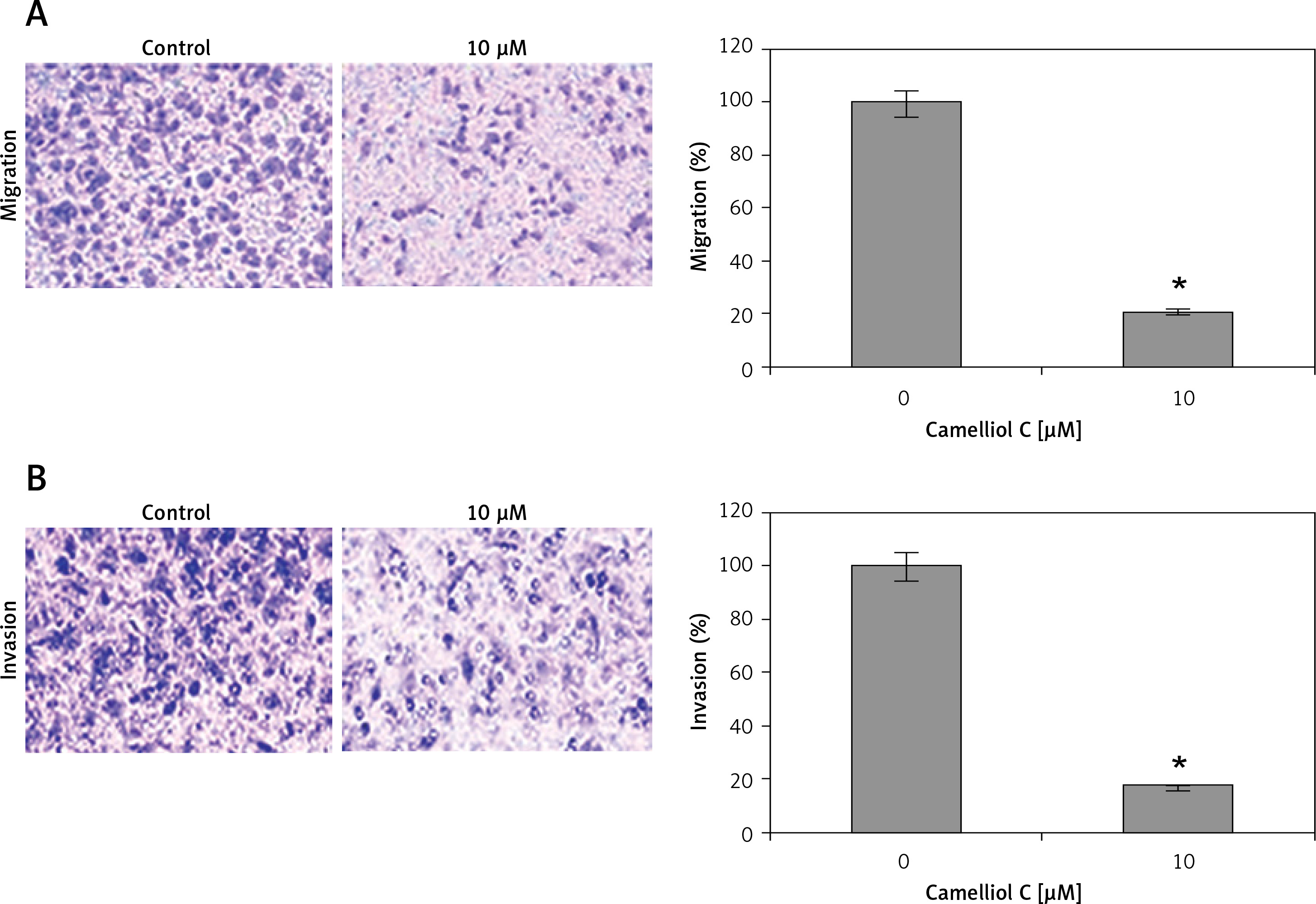 Determination of the effects of camelliol C on the migration and invasion of the human HELA cervical cancer cells was done by transwell assays. The results revealed that the camelliol C suppressed the migration of the HELA cell concentration dependently (Figure 6 A). The effects of camelliol C were also determined on HELA cell invasion, and the results were similar to those for cell migration (Figure 6 B).