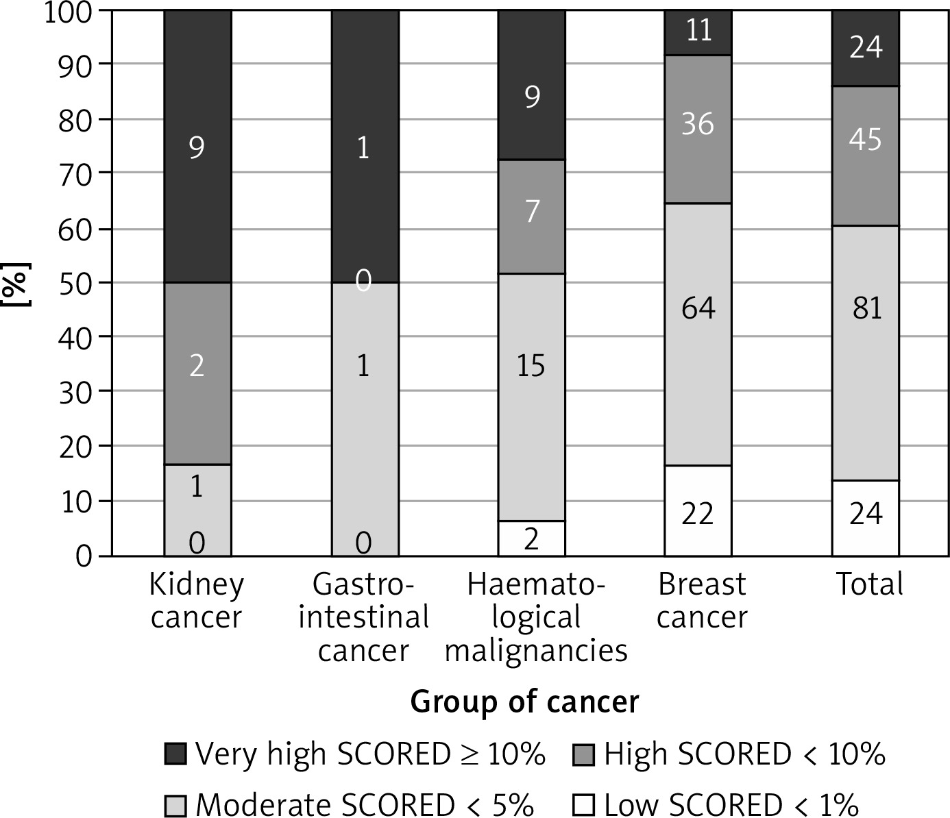 The most prevalent CV risk factors in our group were arterial hypertension (37.3% of pts), dyslipidaemia (27.8%), and diabetes mellitus (8.3%). 31.7% (108) of patients were smokers. The mean BMI value was 26.4 ±4.8 kg/m<sup>2</sup>, and in the whole group 7.5% of patients were underweight, 36.3% had normal weight, 35.6% patients were overweight, and 20.7% were obese. The average value for CV risk estimated by SCORE was 4.6 ±5.1% for the whole group. 13.8% of patients had low (SCORE < 1%), 46.6% moderate (< 5%), 25.9% high (< 10%), and 13.8% had very high CV risk (≥ 10%). The SCORE risk estimate correlated with BMI in the whole group of patients. More obese persons had higher SCORE risk value (p = 0.004), similarly to the patients with lower estimated GFR (p = 0.012). We took two approaches to test for relationship between SCORE and type of cancer, either using the calculated SCORE as a continuous variable using ANOVA test or a discrete variable according to the risk categories (Figure 2). Both approaches revealed statistically significant differences between the groups. In the ANOVA tests we identified the relationship between the group of cancer and SCORE (p = 0.001), and using post-hoc Tukey’s test we infer that the breast cancer had significantly lower CV risk than that with haematological malignancies (Δ = –3.49 ±0.95%; p = 0.002). When we analysed SCORE classes as ranks using nonparametric tests, the patients with kidney cancer had significantly higher risk than patients with breast cancer. In both cases, breast cancer patients appeared to be less affected by CV risk factors as compared to the other cancer types, even though the latter had much lower representation in our group. The distribution of major risk factors (diabetes, arterial hypertension, smoking, dyslipidaemia, overweight, and obesity) across the cancer types is shown in Figure 3, and only 19% were free of any of the factors.