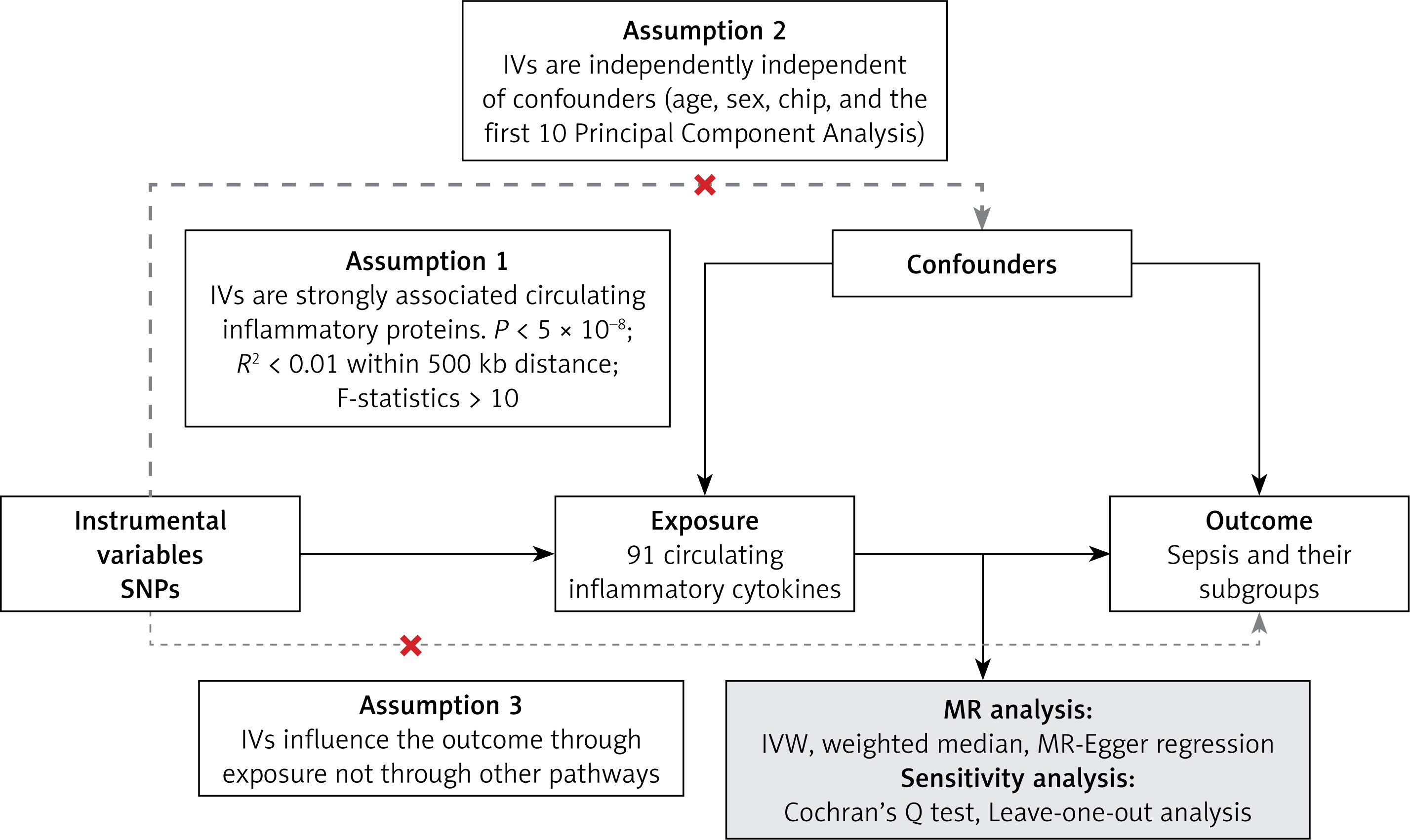 Mendelian randomization (MR) utilizes genetic variants as instrumental variables to infer causal relationships free of biases inherent to traditional observational research [6–8]. By integrating publicly available genome-wide association study (GWAS) summary statistics, two-sample MR enables efficient large-scale evaluation of causal effects for diverse exposures [9, 10]. Here we performed a comprehensive two-sample MR study to investigate potential causal impacts of circulating inflammatory proteins on sepsis risk. Our findings help delineate roles of key inflammatory mediators in sepsis development, while providing targets for future mechanistic and clinical investigation.