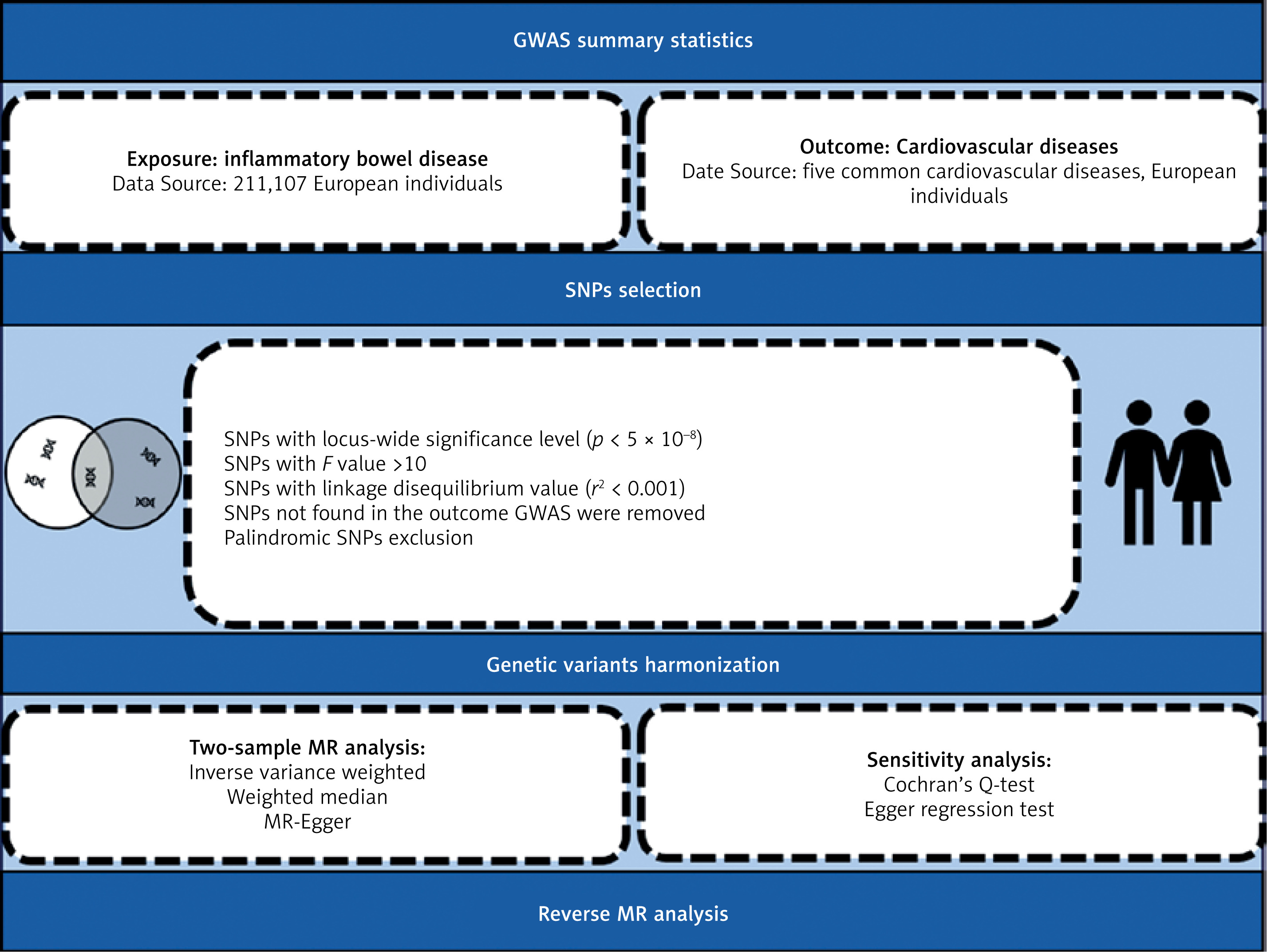 In Mendelian randomization (MR) analysis, single nucleotide polymorphisms (SNPs) which have a strong relationship with exposure, for example IBD, are considered as instrumental variables (IVs) to estimate the causal effect with outcome (e.g., CVDs). MR is a ‘natural’ RCT that makes use of the random distribution of genetic variants with an influence on exposure [5–7]. Those SNPs that are strongly linked with confounders will be eliminated before performing the MR analysis in order to remove the effect of confounding factors. Reverse MR analysis can exclude potential reverse causal effect between exposures and outcomes [8–10].