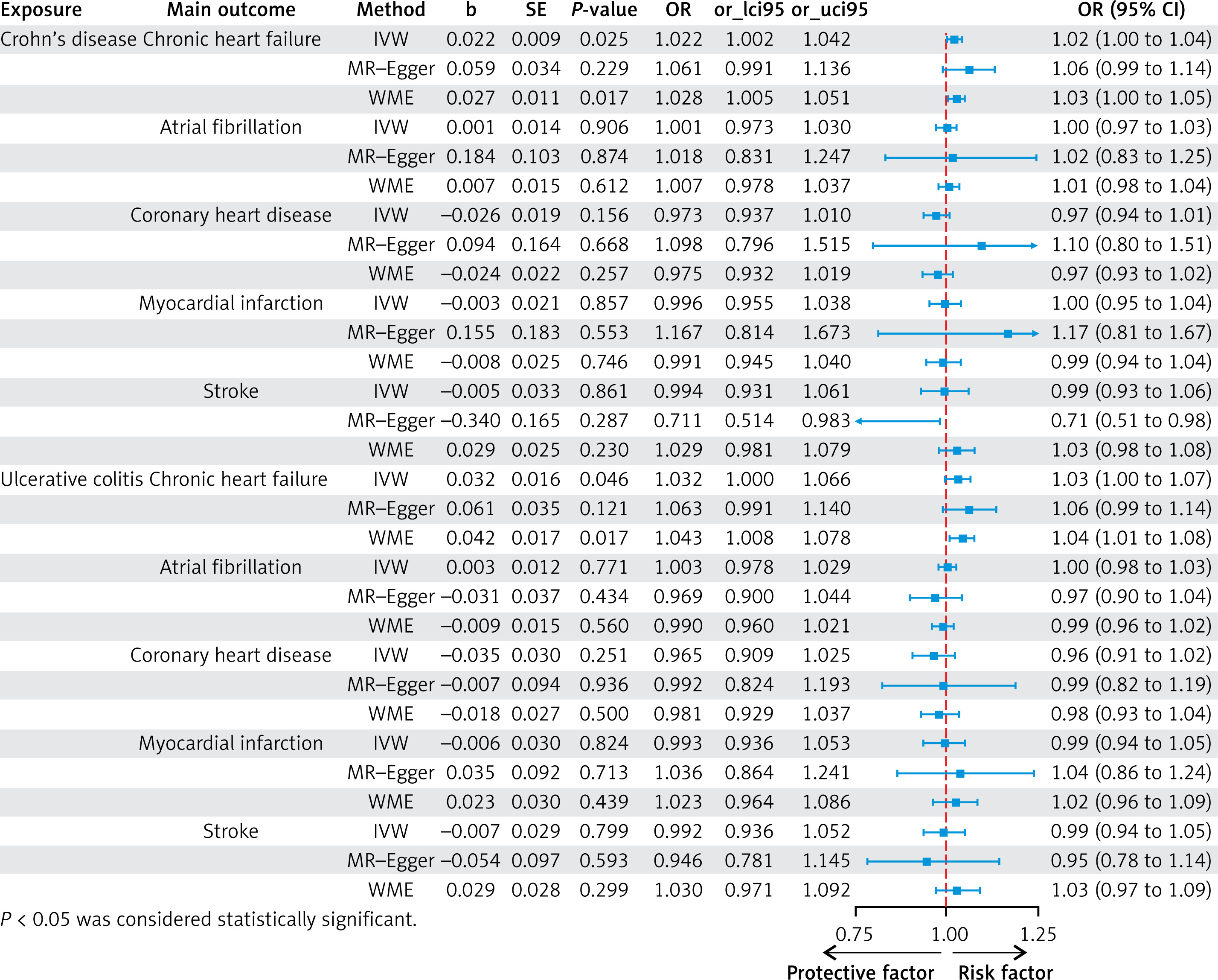 In this study, IVW was used to evaluate the potential causal relationship between inflammatory bowel disease and the risk of CVD by calculating the OR and 95%CI. MR-Egger regression, weighted median (WME), and weighted mode (WM) were used as supplementary methods of IVW. When the IVW method yielded p < 0.05 and MR-Egger regression, WME and WM had the same direction, it was considered a relatively stable causal correlation [11].