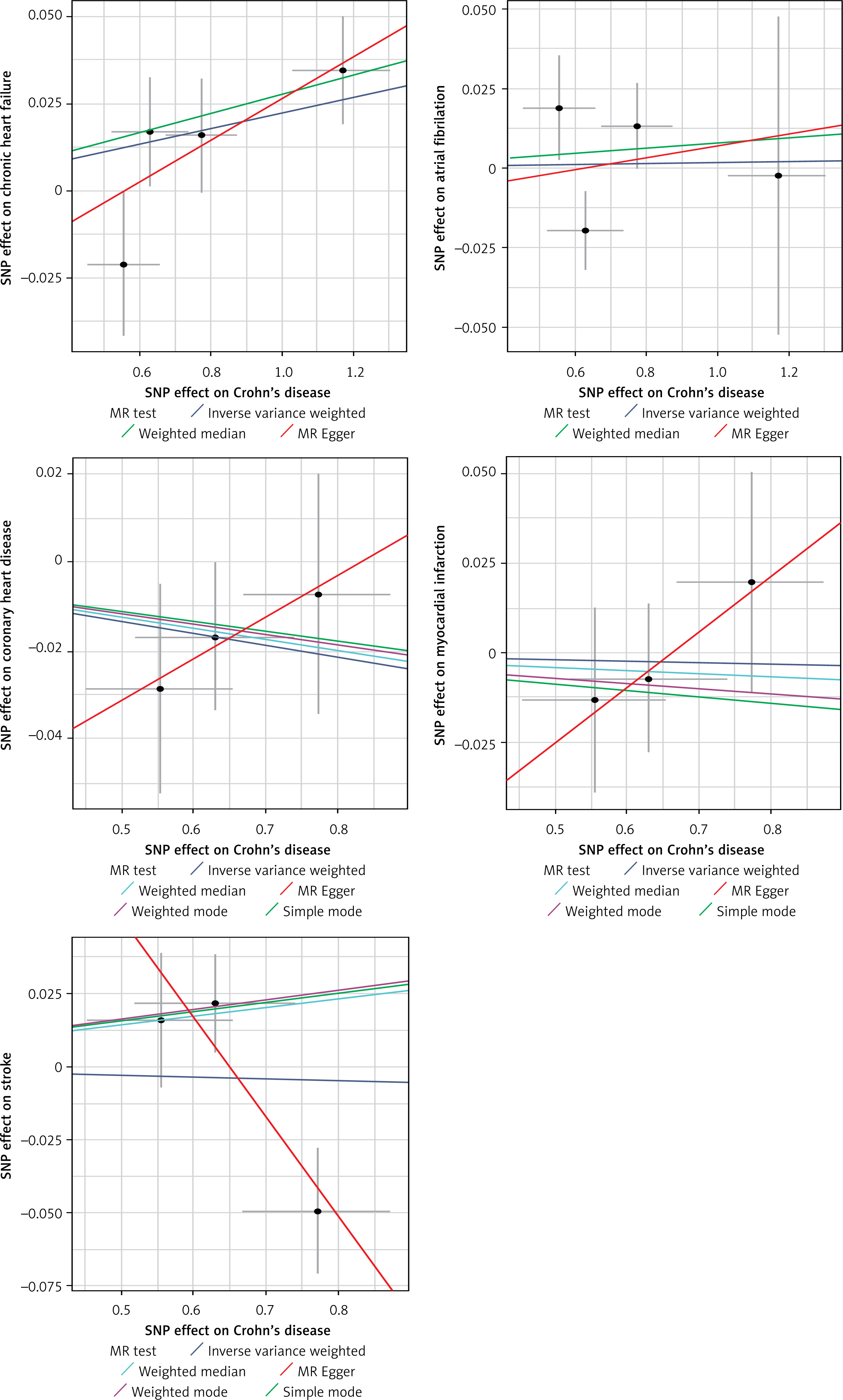 We observed a positive correlation between genetic prediction of CD and the risk of chronic heart failure (IVW (OR = 1.02; 95% CI: 1.00–1.04; p = 0.025)); there was a positive correlation between UC and the risk of chronic heart failure (IVW (OR = 1.03; 95% CI: 1.00–1.06; p = 0.04)); no causal association was observed between CD and UC and atrial fibrillation, coronary heart disease, myocardial infarction or hypertension.
