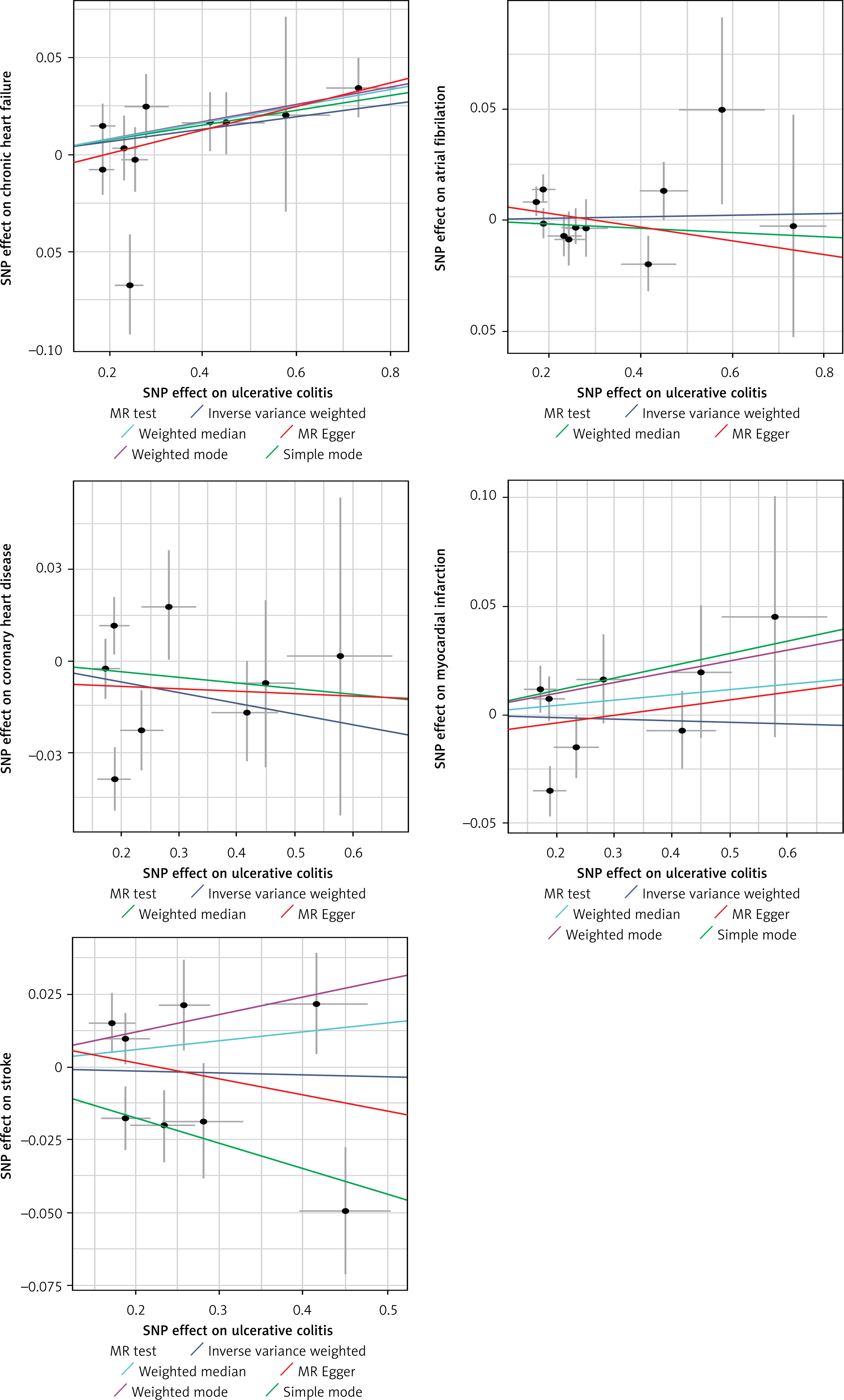 Inflammatory bowel disease (IBD) is a chronic inflammatory bowel disease with complex etiology, and its risk factors are still unclear [17]. In recent years, Mendelian randomization (MR) has received more and more attention in IBD research [17–19]. MR mainly uses genetic variation as a tool to derive the causal relationship between exposure and outcome, which effectively avoids the influence of confounding factors and reverse causality in observational studies and randomized controlled trials. In this study, MR analysis was used to evaluate the causal relationship between IBD and CVDs in the European population. Based on the large-scale GWAS database, it was found that there was a positive correlation between CD, UC, and chronic heart failure, but no causal correlation between IBD and other CVDs.