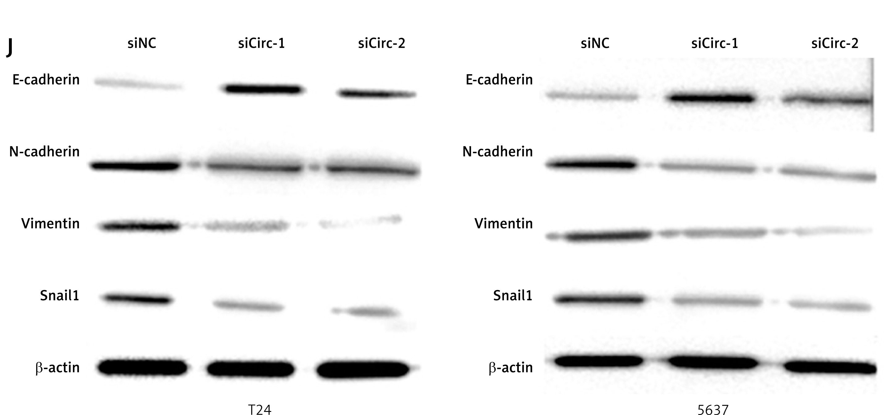CircRNA_103809 silencing suppresses proliferation, migration, and invasion of bladder cancer cells in vitro. A – Levels of circRNA_103809 in urothelial cell line UROtsa and bladder cancer cells. B – Levels of circRNA_103809 and linear RNA ZFR within 24 h were measured by qPCR. C – Level of circRNA_103809 under treatment of RNase R was measured by qPCR. D – Intracellular localization of circRNA_103809 was detected by FISH assay. E – Level of circRNA 103809 in bladder cancer cells after transfection with sicircRNA_103809. F – Level of circRNA_103809 in bladder cancer cells after transfection with circRNA_103809 overexpression vectors. G – Growth of bladder cancer cells after transfection with sicircRNA_103809. H, I – Migration and invasion of bladder cancer cells after transfection with sicircRNA_103809. J – Protein levels of E-cadherin, N-cadherin, vimentin, and Snail in bladder cancer cells were measured by western blotting assay. *p < 0.05, **p < 0.01, ***p < 0.001 *p < 0.05, **p < 0.01, ***p < 0.001