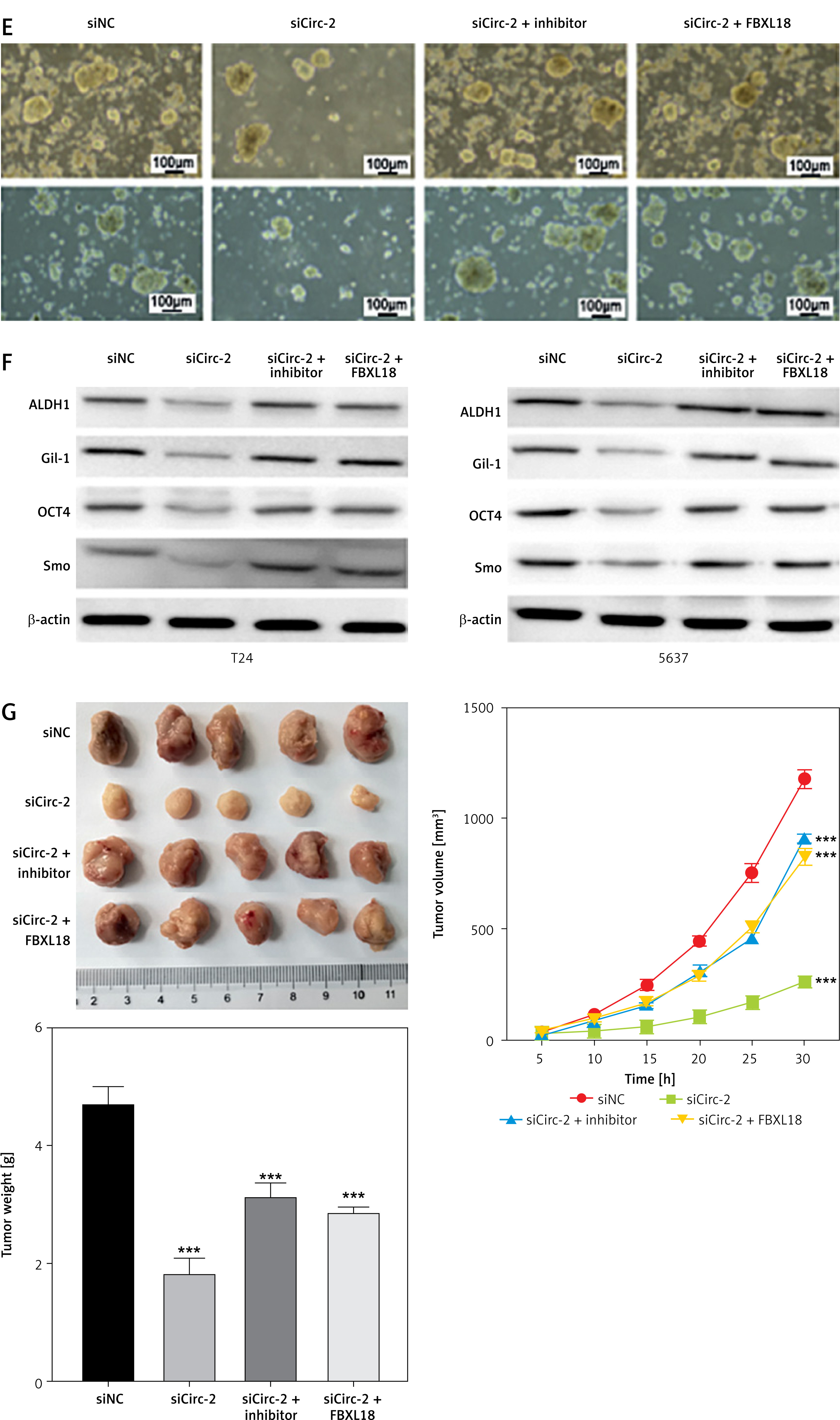 CircRNA_103809 targets the miR-516a/FBXL18 signaling pathway to modulate bladder cancer cell phenotypes. A–F – T24 and 5637 cells were transfected with sicircRNA_103809, miR-516a inhibitors, and FBXL18 overexpression vectors. Then (A) cell viability. (B and C) cell migration and invasion, (D) protein levels of cell migration and invasion biomarkers, (E) sphere formation ability, and (F) protein expression of stemness markers were measured. G – A xenograft model was established and treated with sicircRNA_103809, miR-516a inhibitors, and FBXL18 overexpression vectors. Then tumor size, tumor growth curve, and tumor weight were measured. (E) sphere formation ability, and (F) protein expression of stemness markers were measured. G – A xenograft model was established and treated with sicircRNA_103809, miR-516a inhibitors, and FBXL18 overexpression vectors. Then tumor size, tumor growth curve, and tumor weight were measured. ***p < 0.001