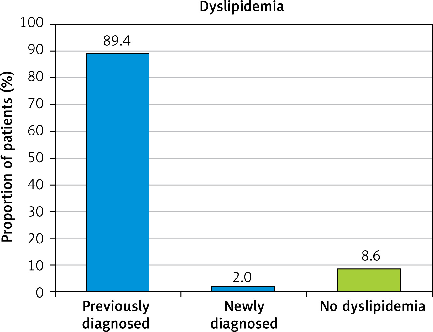 Overall, 89.4% of patients had been diagnosed with dyslipidemia at a prior visit, with a further 2.0% diagnosed at the index study visit (Figure 1). The mean value of all patients was within the normal limits for TC (4.44 mmol/l), and desirable for HDL-C (1.20 mmol/l, and triglycerides (1.68 mmol/l) (Table II). However, the mean LDL-C level was high considering the presence of heart disease: 2.69 mmol/l.