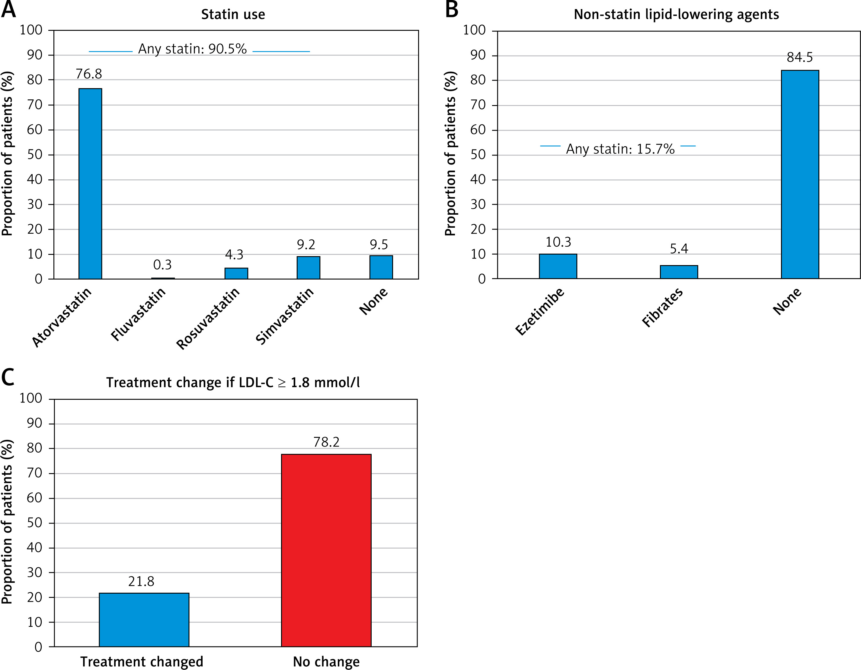 Lipid-lowering therapy. A – Type of statin treatment; n = 349. B – Type of non-statin lipid-lowering agents used (n = 349); 1 patient received both ezetimibe and fibrates. C – Lipid-lowering therapy modification during the study visit in patients failing to meet the < 1.8 mmol/l LDL-C target