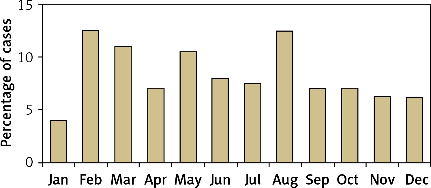 The mean follow-up period was 34.4 ±14.6 weeks (range: 24–104 weeks) after complete resolution of SAT. The patients had a mean age of 42 years (range: 24–78 years), and SAT occurred more than 3 times more often in women than in men (Table I). Although SAT occurred more frequently during the spring and summer, its incidence did not differ significantly by month or season (p = 0.329 and 0.534, respectively; Figure 1).